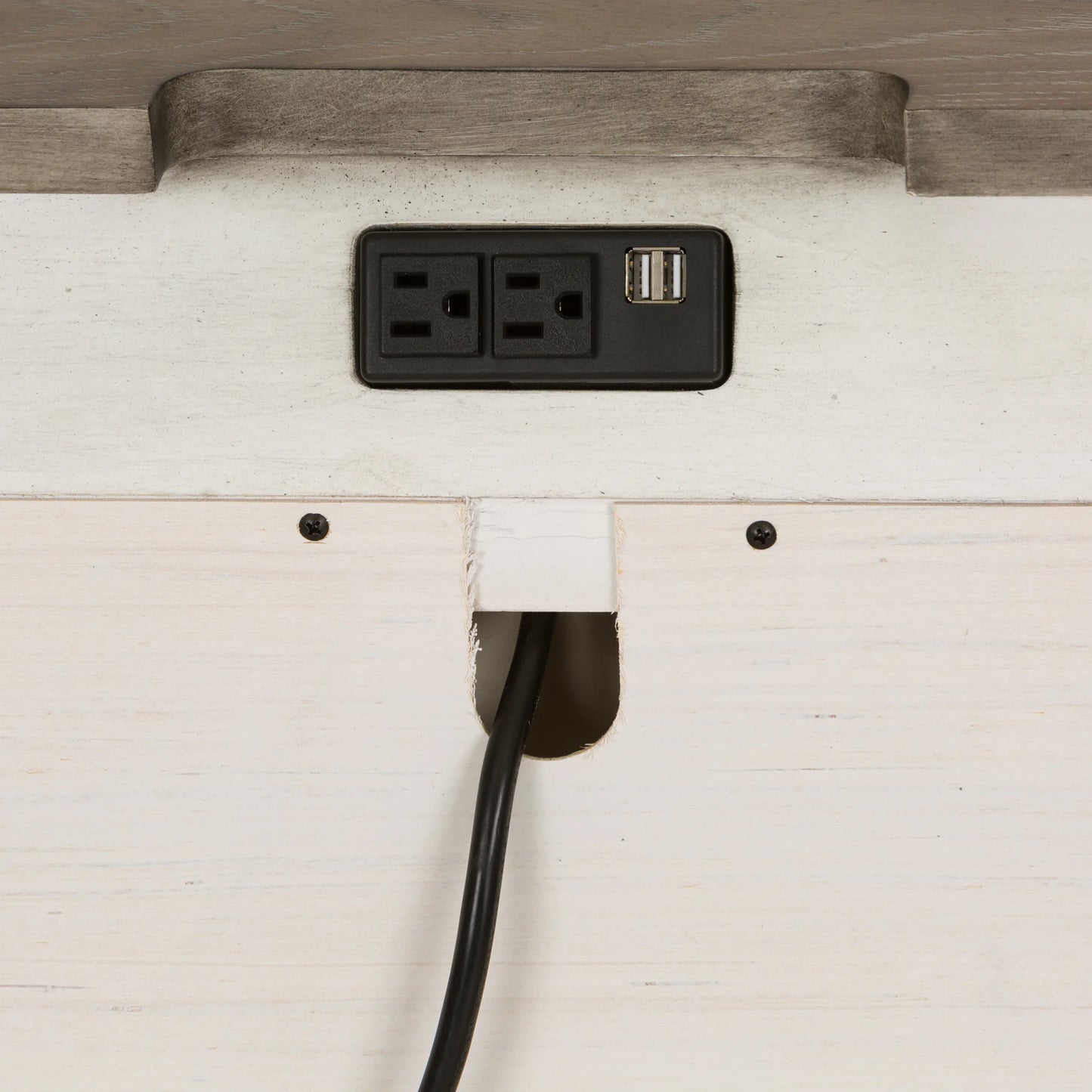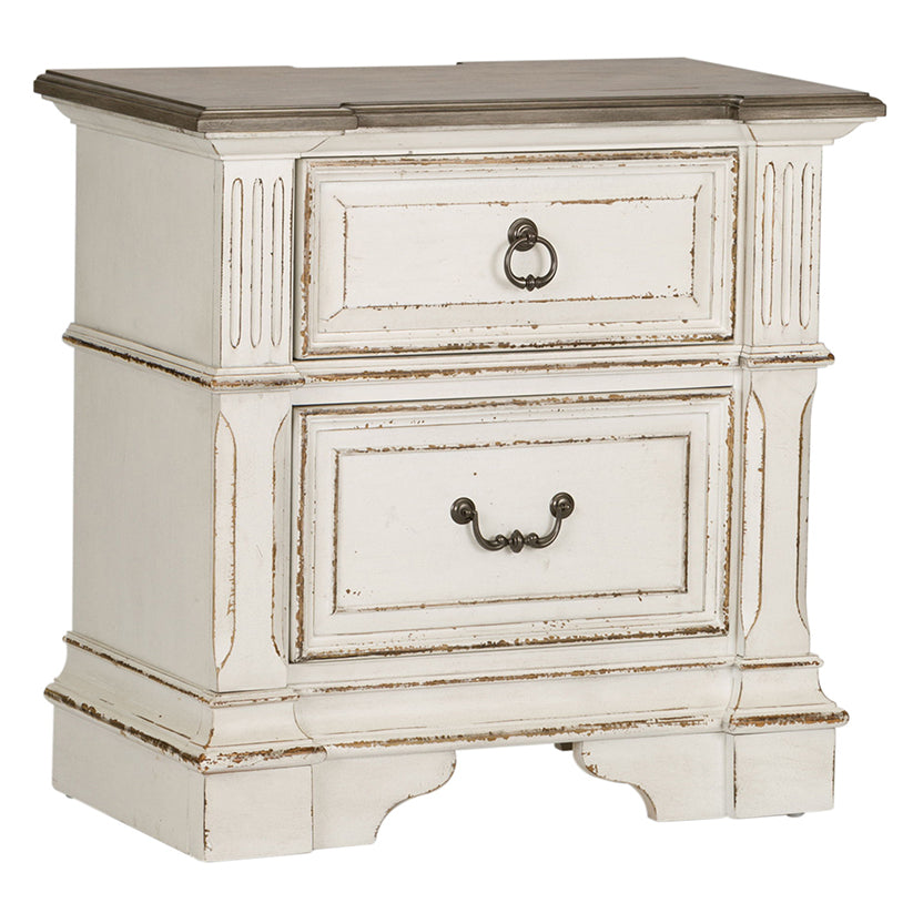This 2 drawer night stand is the perfect way to accent your room with an effortless blend of European Traditional design. Weathered brown whitewash top and antique white finish, combined with heavy chipping, creates a truly unique look. Enjoy the convenience of having a built-in charging station in the back of the night stand, featuring two USB ports and two outlets. The post design with fluted top accents and chamfered edges completes this traditional piece.