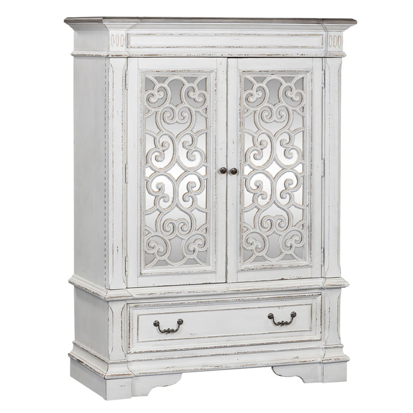 The Abbey Park mirrored door chest is the perfect way to accent your room with an effortless blend of European Traditional design. Weathered brown whitewash top and antique white finish, combined with heavy chipping, creates a truly unique look. The mirrors accented by a gird overlay truly completes this traditional piece.