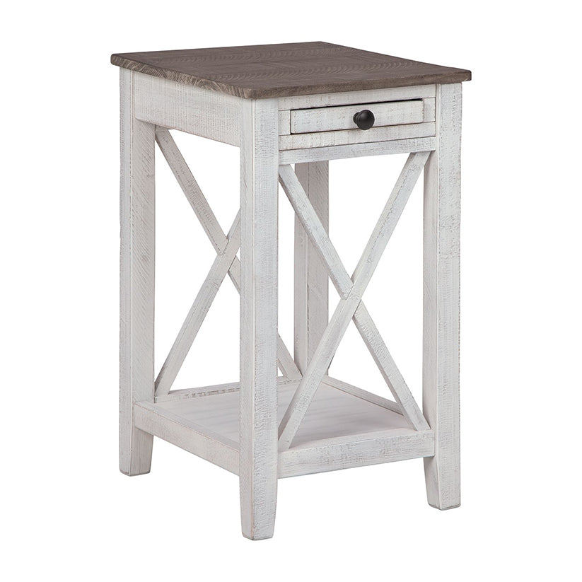 Modern meets vintage in this accent table. Made of woods in a distressed white and gray finish, the crossbuck supports on two sides create a vintage vibe. With two USB charging ports, the accent table also adds modern function. The storage shelf and drawer make this piece a must-have for your living space.