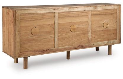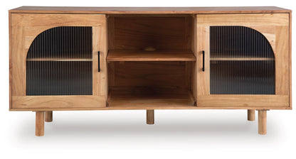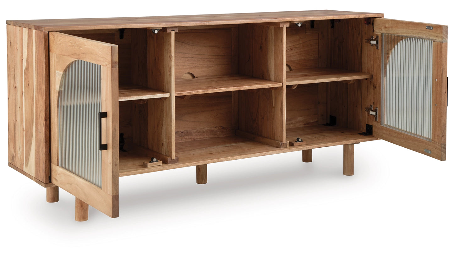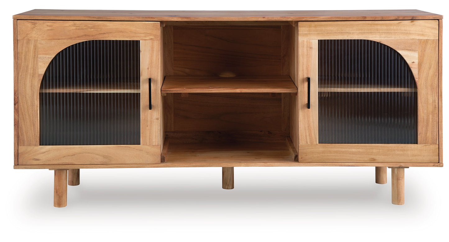 Simply chic storage awaits with this accent cabinet. With the versatility to act as a classic sideboard or a trendy TV stand, it’s at home in settings ranging from casual to modern. Doors with curved half-arch glass inserts soften the clean-lined look, while the removable shelves inside give you that much more flexibility. Openings in the back for electronics keep cables neatly organized, and the open middle shelving acts as a perfect host for media consoles.