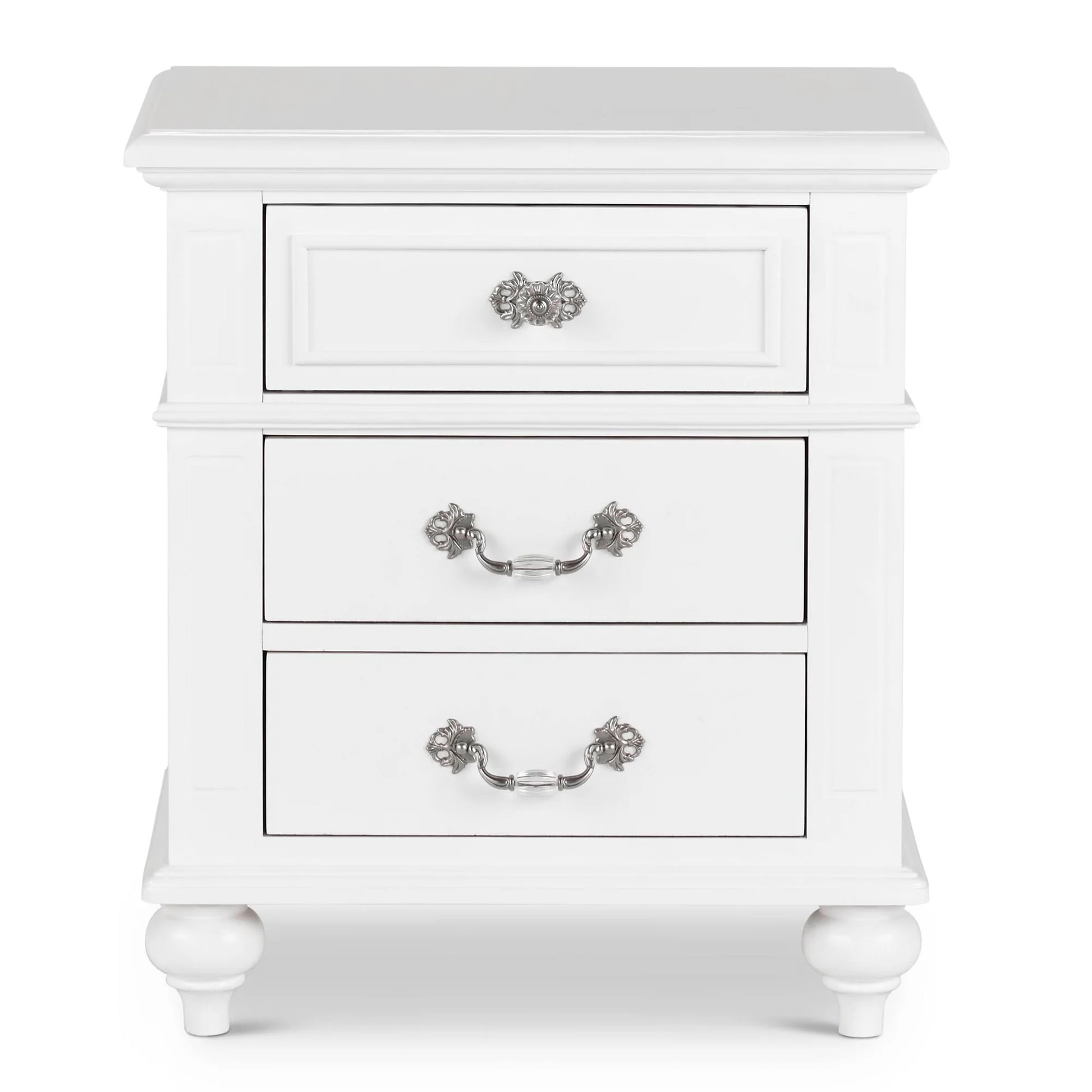 The Alana 3-Drawer Nightstand is the perfect bedside addition to your bedroom! This nightstand comes with three, spacious drawers; perfect for keeping all of your bedside belongings within reach. The bottom drawer features a dust proofing bottom to help keep all of your belongings in great condition. The crystal-like drawer handles and knob add an extra layer of style to this already stunning piece. Bevel edges and a clean, crisp white finish complete the look of this transitional design.