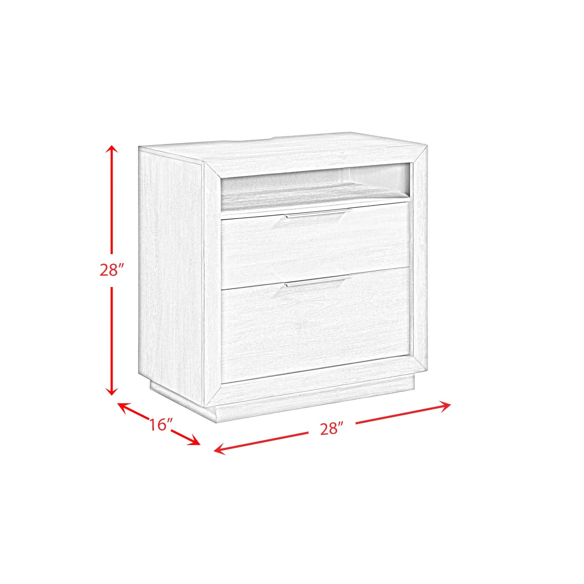 The Arcadia 2-Drawer Nightstand in Grey combines modern style with practicality. With its sleek design and clean lines, this nightstand adds a contemporary touch to any bedroom decor. It features two spacious drawers, allowing you to keep your belongings organized and easily accessible. The top drawer is lined with black felt, providing a soft and protective surface for your delicate items. The built-in power outlets and USB ports make charging your devices convenient and hassle-free. Finished with polished metal handles in nickel finish, this nightstand is both functional and stylish.