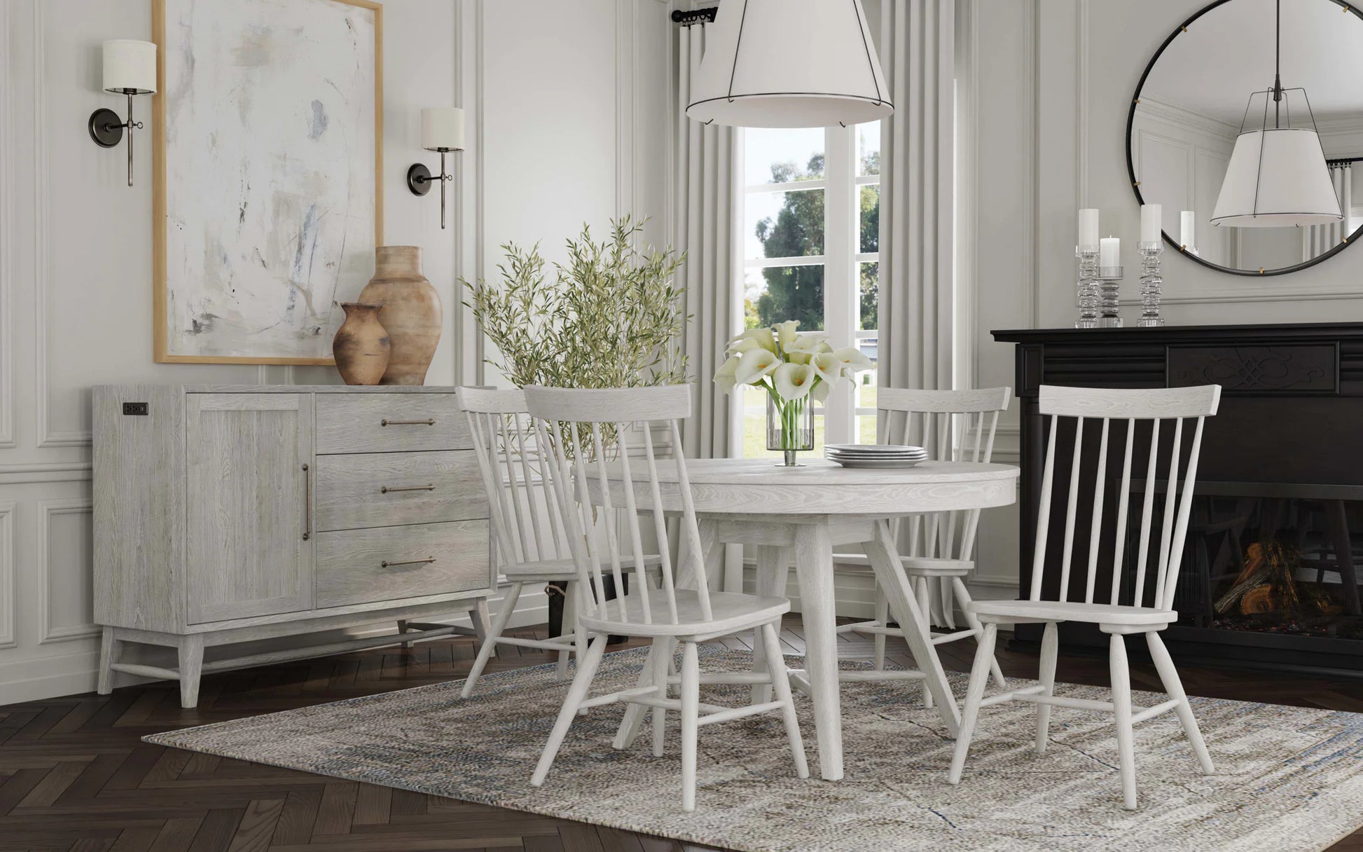 The Bayside Dining Collection offers simple lines, timeless modern style, designed to fit today’s contemporary homes. Constructed of Solid Ash and Ash Veneer. Available in two classic finishes – Black or White. The unique bar pull hardware has a light, distressed bronze finish.