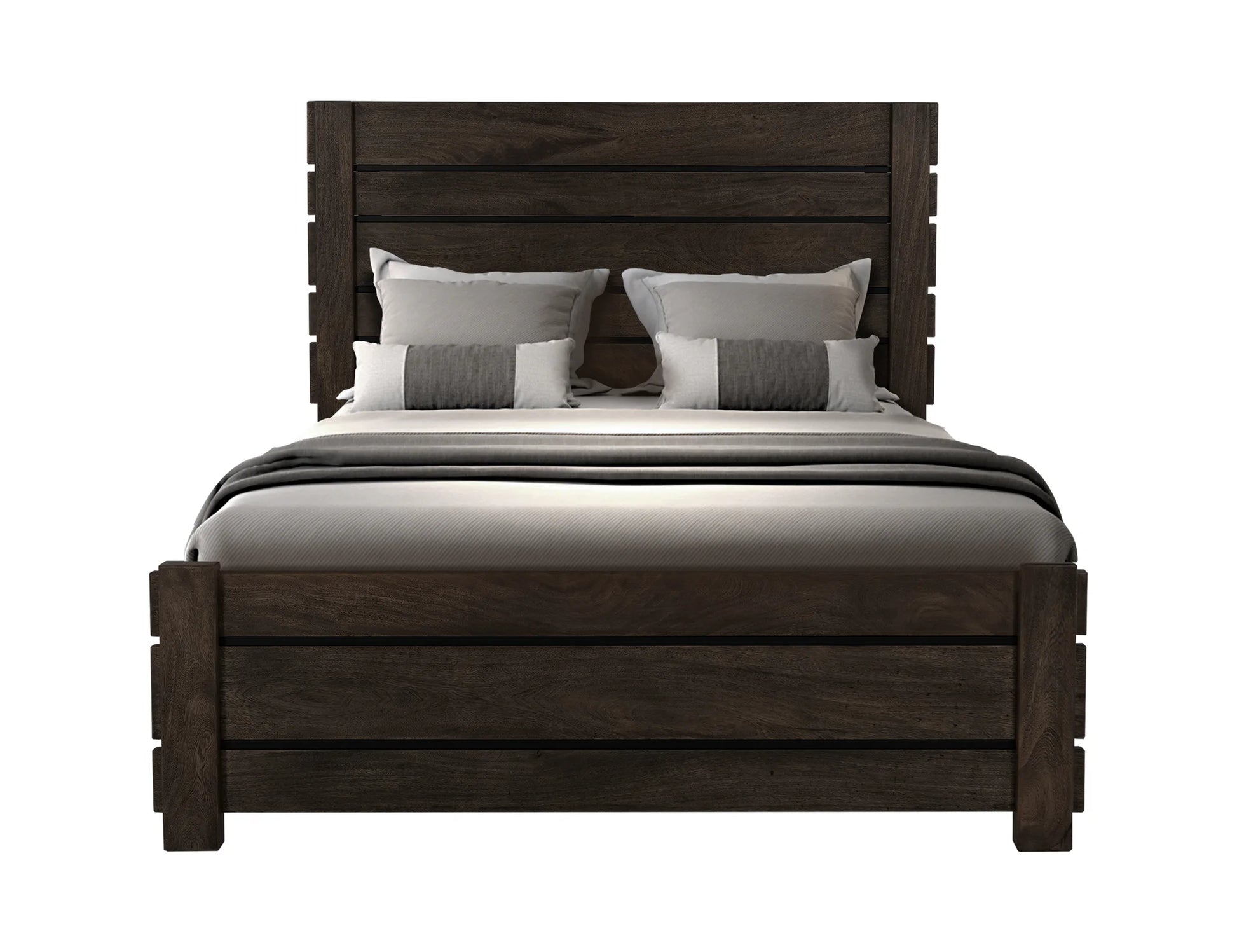 - The Merida Collection features an exquisite bedroom set that perfectly fuses sustainability and design, embodying eclectic modern style. Made from environmentally friendly mango and melina wood, it combines beauty and functionality to enhance your space. The black finish highlights the natural elegance of the wood, creating a serene and inviting atmosphere. The slatted headboard and footboard, designed for timeless appeal, is carefully crafted to achieve a sleek and modern look. The metal accents between the slats on both add an industrial touch, enhancing the overall design. This versatile bedroom set complements a wide range of interior styles, maKing it an ideal addition to any bedroom.
