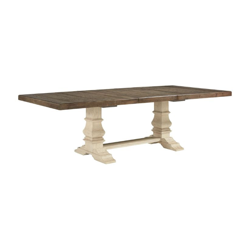 Whether your style is farmhouse fresh, shabby chic or country cottage, you'll find this extension dining table works on so many levels. The table's two-tone finish, with weathered gray on the tabletop and textured antiqued white on the double-pedestal base, offers twice the character and twice the appeal. An extension leaf makes it easy to comfortably add more guests in no time.