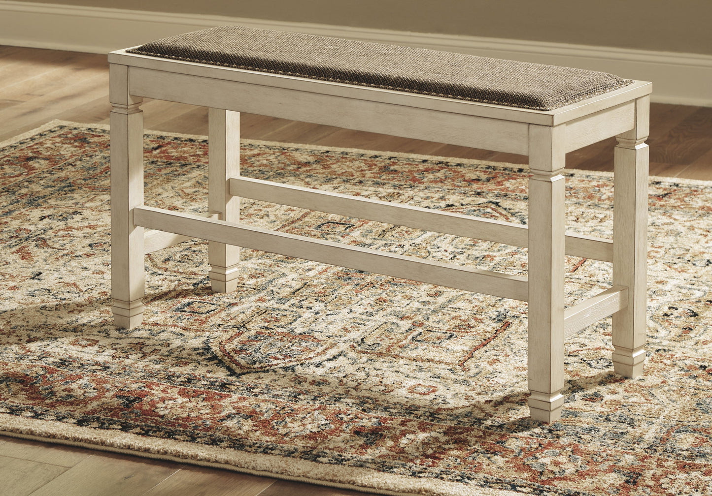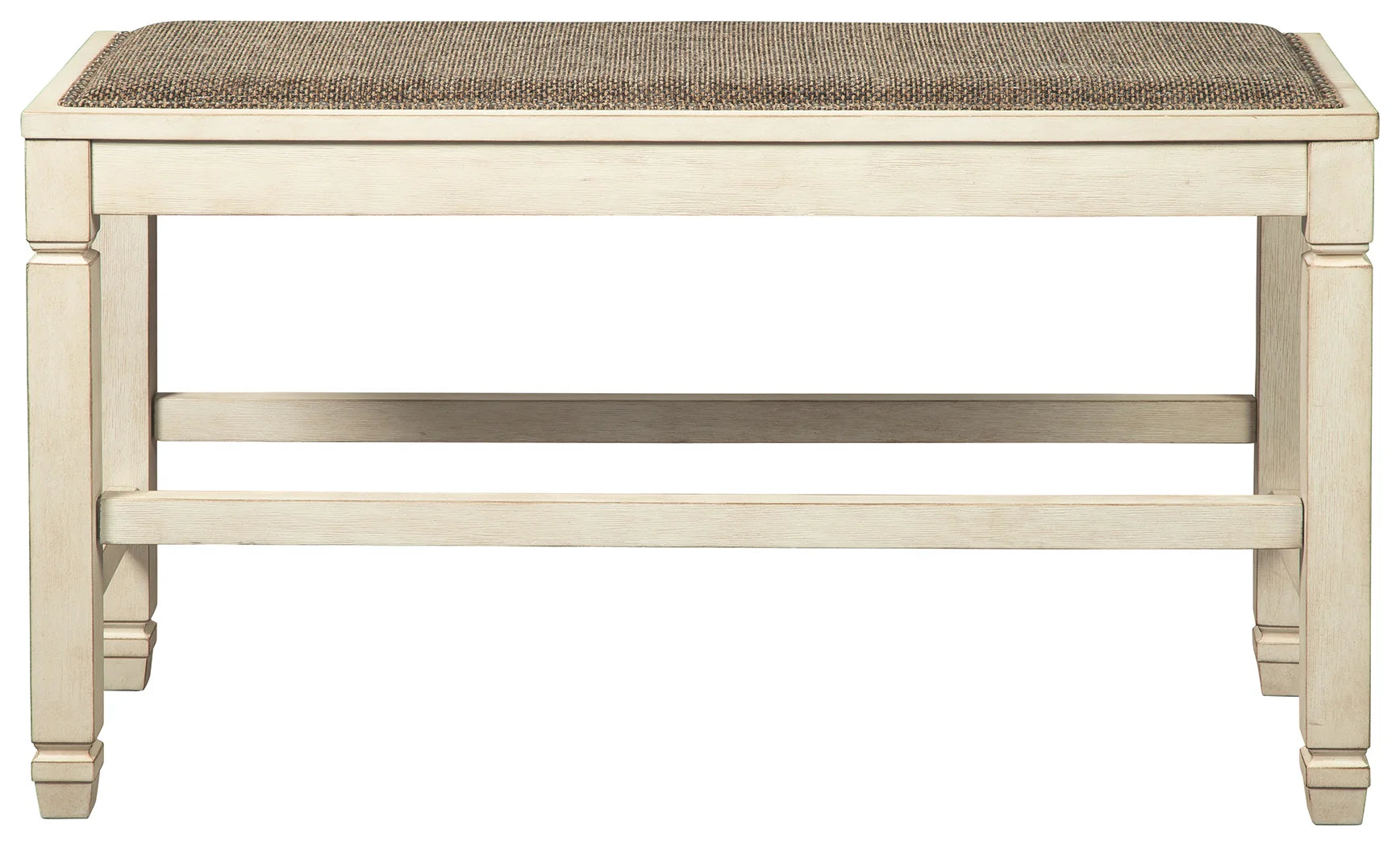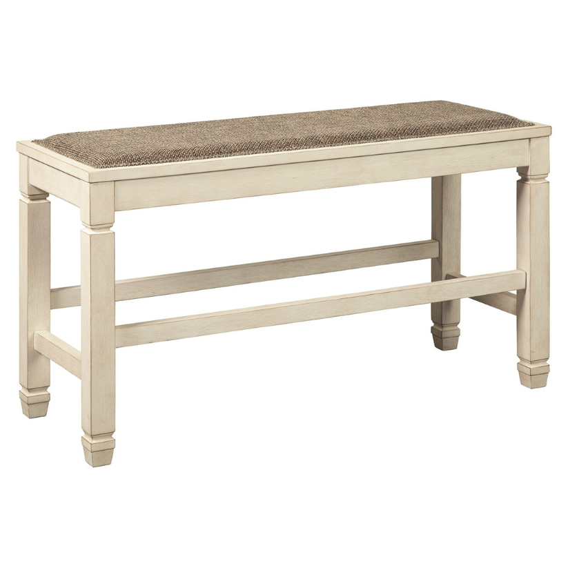 The beauty of this upholstered dining bench is something to savor. Serving up comfort and flair, this generously scaled counter-height bench entices with a cushioned seat covered in a heavy woven fabric that complements the antiqued white finish.