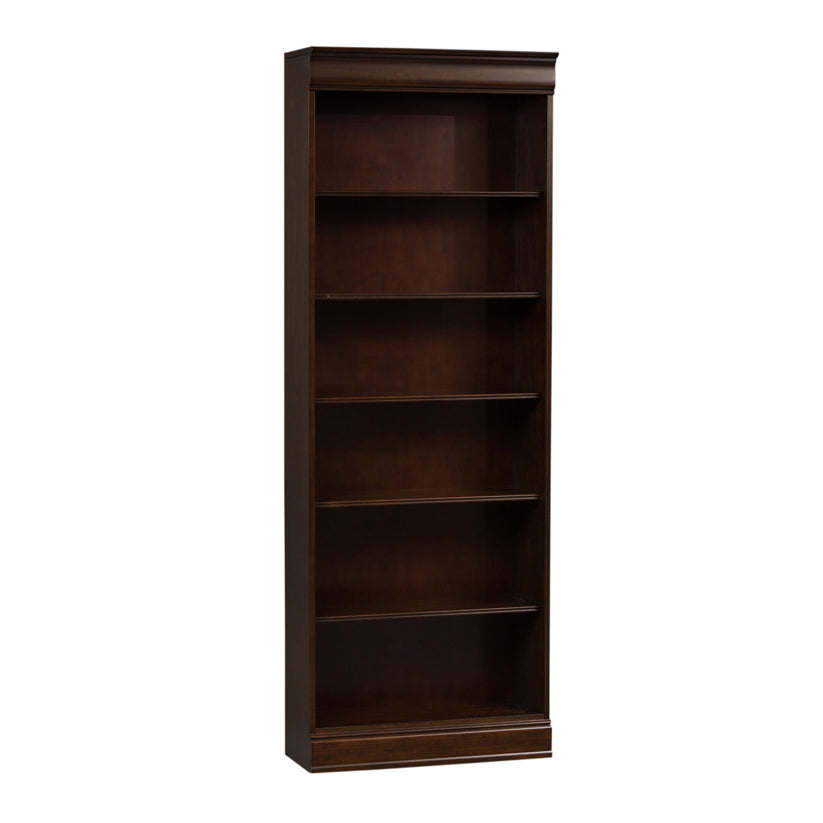 Create scale, add comfort, and define your style with the Brayton Manor Jr executive 84" bookcase. Crafted with poplar solids with cherry and birch veneers, this piece features a smooth cognac finish and adjustable shelving. Crown molding outlines five shelves and the bottom panel, which acts as a sixth shelf. Expand this piece, as it can be bunched!