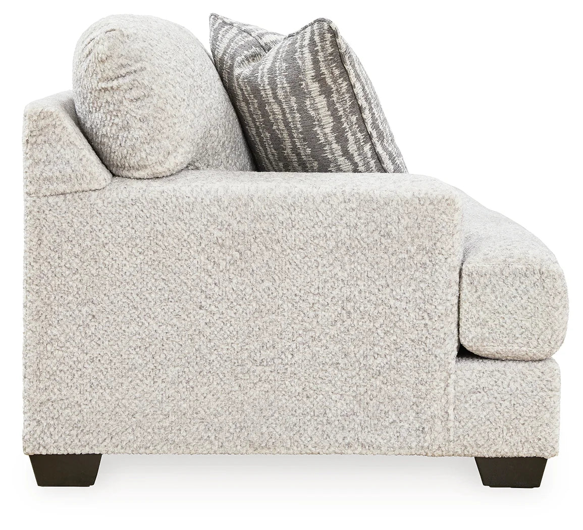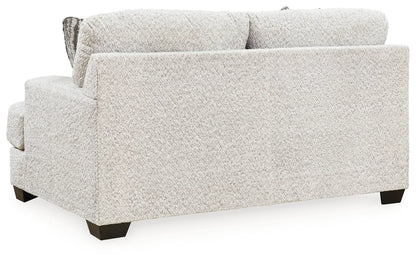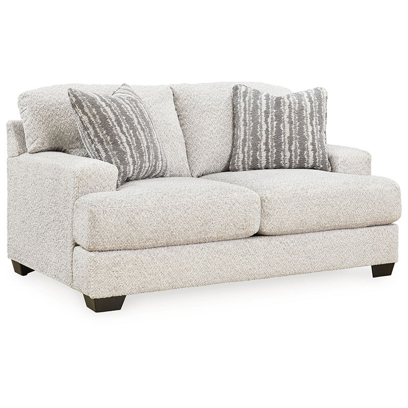 This loveseat speaks to those drawn to fresh, contemporary style with richly neutral appeal. Wrapped in a wonderfully plush fabric loaded with multi-tonal interest, this on-trend piece has a warm, welcoming charm. Coordinating accent pillows add to the indulgence. Kick back, relax and settle in for comfort with this cool addition for modern spaces.