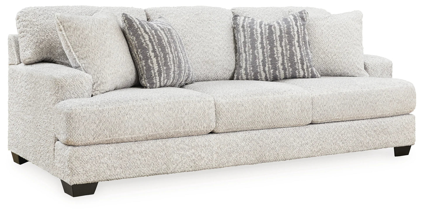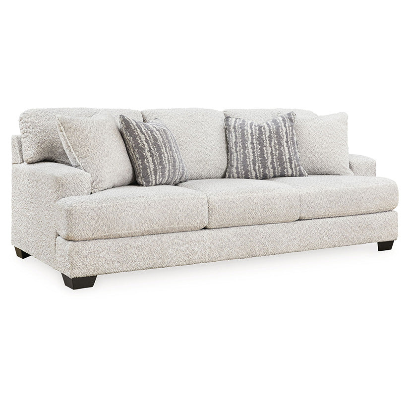 This sofa speaks to those drawn to fresh, contemporary style with richly neutral appeal. Wrapped in a wonderfully plush fabric loaded with multi-tonal interest, this on-trend piece has a warm, welcoming charm. Coordinating accent pillows add to the indulgence. Kick back, relax and settle in for comfort with this cool addition for modern spaces.
