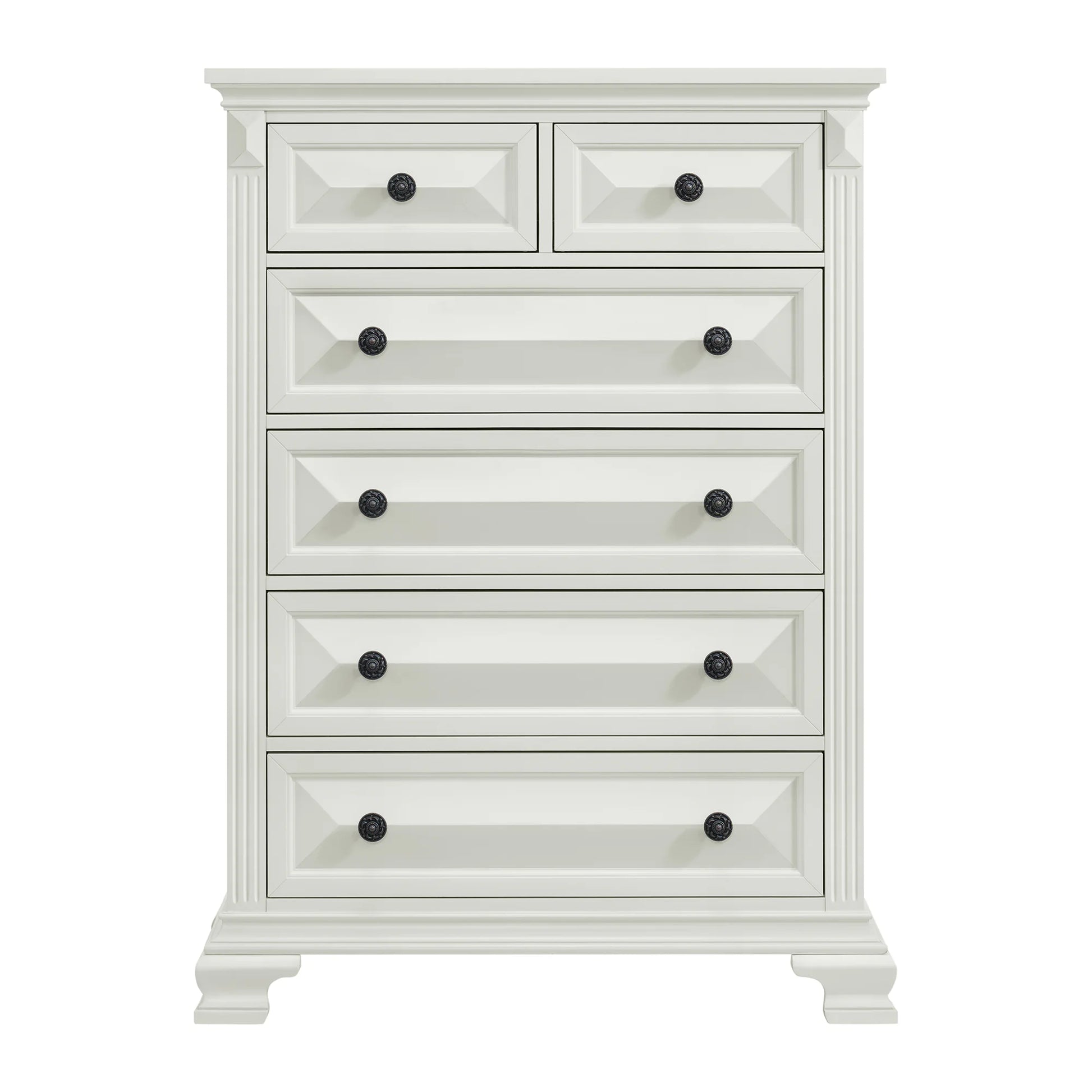 The Bridgestone 6-Drawer Chest in Antique White is the perfect addition to any bedroom. This case piece is designed with beautiful beveled design throughout, adding a touch of elegance to your decor. It features a beautiful off-white finish, while the metal knob hardware adds a contrasting touch. The top drawers are lined with grey felt to protect delicate items, while the bottom drawer features cedar veneer for added durability. With ball bearing drawer guides and an anti-tipping kit included, this chest is as functional as it is stylish. Bring sophistication and organization to your bedroom with this piece from the Bridgestone collection.