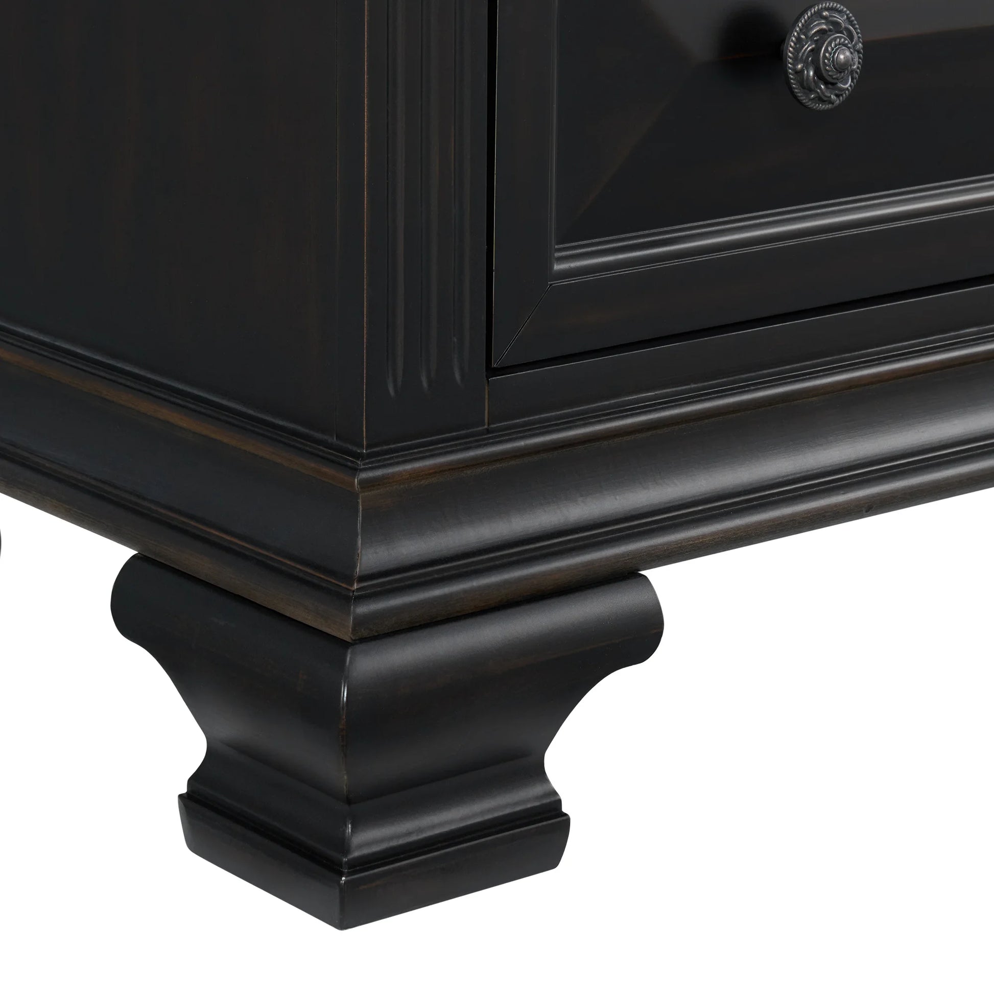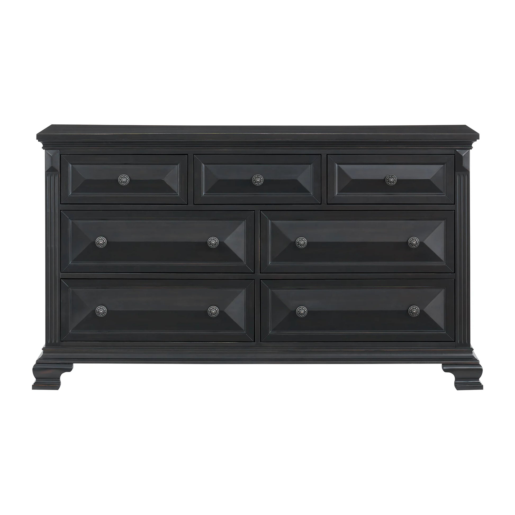 The Bridgestone 7-Drawer Dresser in Black is the perfect addition to any bedroom. This case piece is designed with beautiful beveled design throughout, adding a touch of elegance to your decor. The black finish features faint distressing for a unique look, while the metal knob hardware adds a contrasting touch. The top drawers are lined with grey felt to protect delicate items, while the bottom drawers feature cedar veneer for added durability. With ball bearing drawer guides and an anti-tipping kit included, this dresser is as functional as it is stylish. Bring sophistication and organization to your bedroom with this piece from the Bridgestone collection.