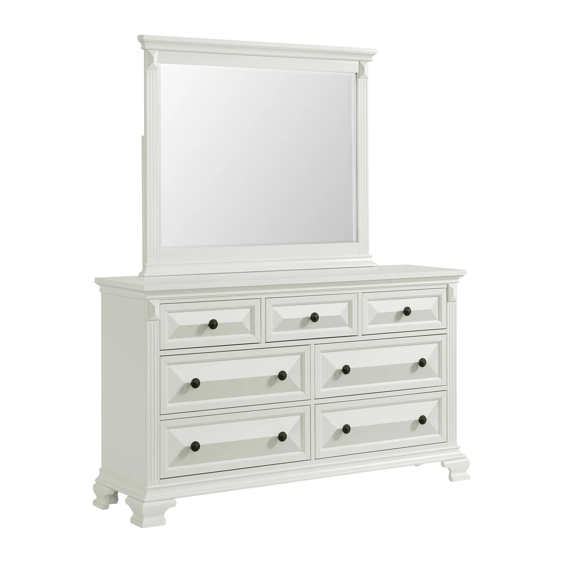 The Bridgestone Dresser and Mirror Set in Antique White is the perfect addition to any bedroom. This set includes a sleek dresser and mirror with beautiful beveled design throughout, adding a touch of elegance to your decor. It features a beautiful off-white finish, while the metal knob hardware adds a contrasting touch. The top drawers are lined with grey felt to protect delicate items, while the bottom drawers feature cedar veneer for added durability. With ball bearing drawer guides and an anti-tipping kit included, this set is as functional as it is stylish. Bring sophistication and organization to your bedroom with these pieces from the Bridgestone collection.