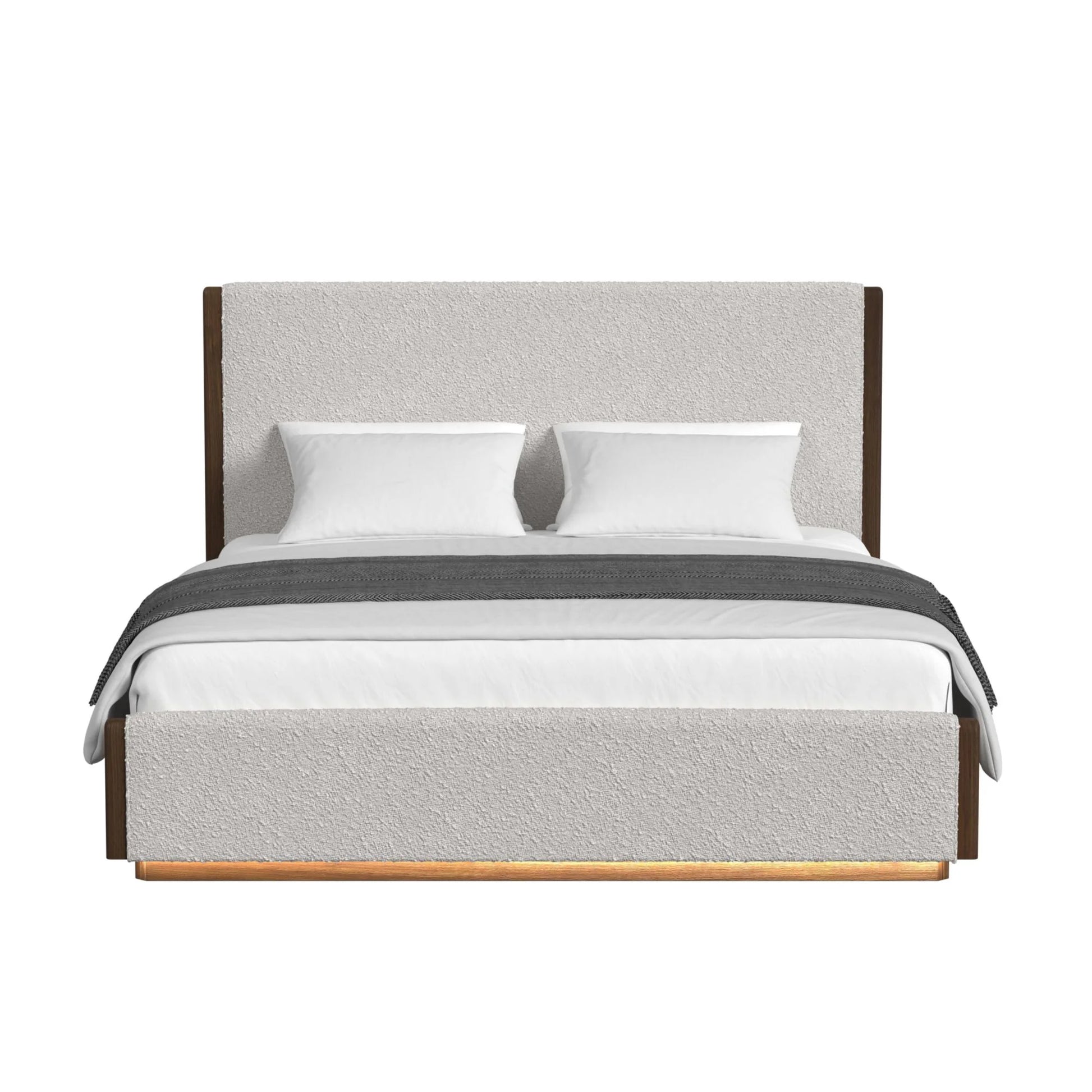 Elevate your bedroom with the refined charm of the Brisbane King Upholstered Bed. Crafted from solid wood with a rich walnut veneer, this bed showcases clean mid-century modern lines and sophisticated simplicity. The headboard and footboard are upholstered in soft, beige bouclé, adding a layer of texture and warmth to the sleek wooden frame. The low-profile design maintains a grounded, modern look, while the footboard's LED Lighting invites relaxation. With its timeless design and thoughtful craftsmanship, the Brisbane King Upholstered Bed adds enduring style and comfort to your bedroom.