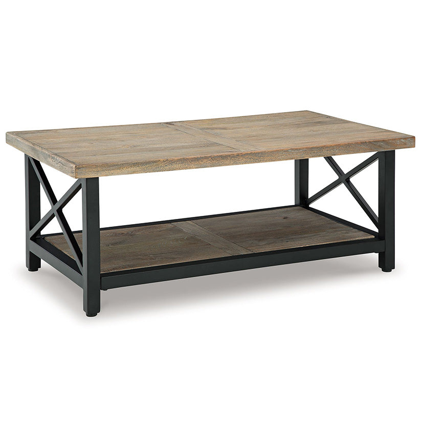 Is your conversation space missing a rustic vibe with functionality? This coffee table offers plenty of room for dining in front of the TV, playing board games or displaying family photos. The quality crafted tabletop sits atop a metal crossbuck frame, infusing just the right amount of urban contemporary design.