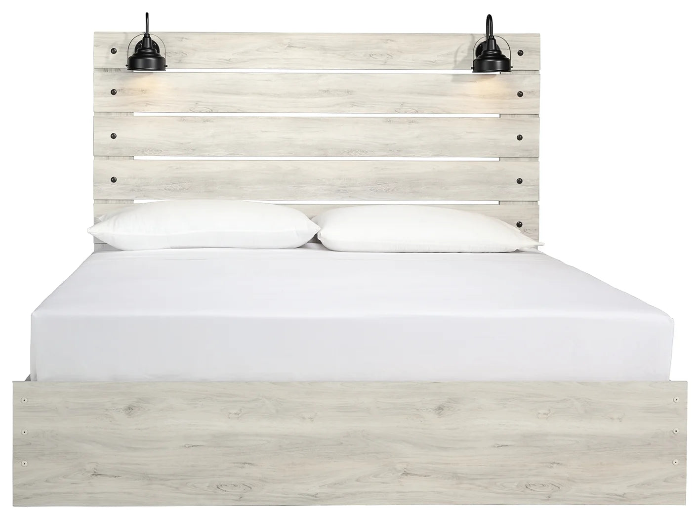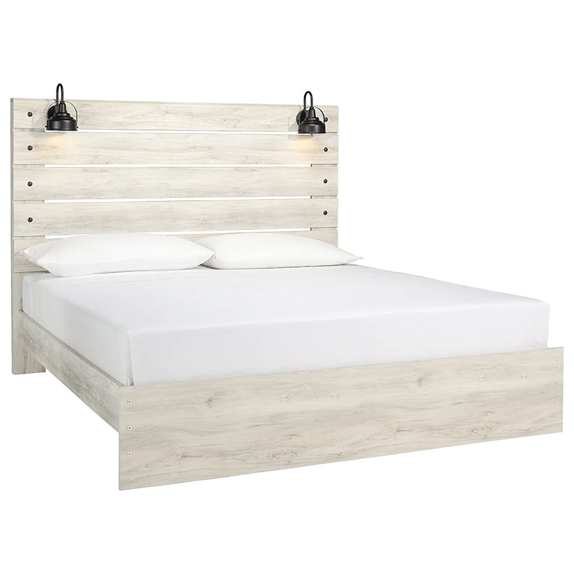 What a delightful take on rustic industrial style. Whether modern loft or modern farmhouse, this king panel bed makes itself at home. The wispy whitewash palette enhances without covering the grain for that weathered look you crave. Love to read in bed? You’re sure to find the retro-chic light sconces and USB plug-ins on the open-slat style headboard such a bright idea.