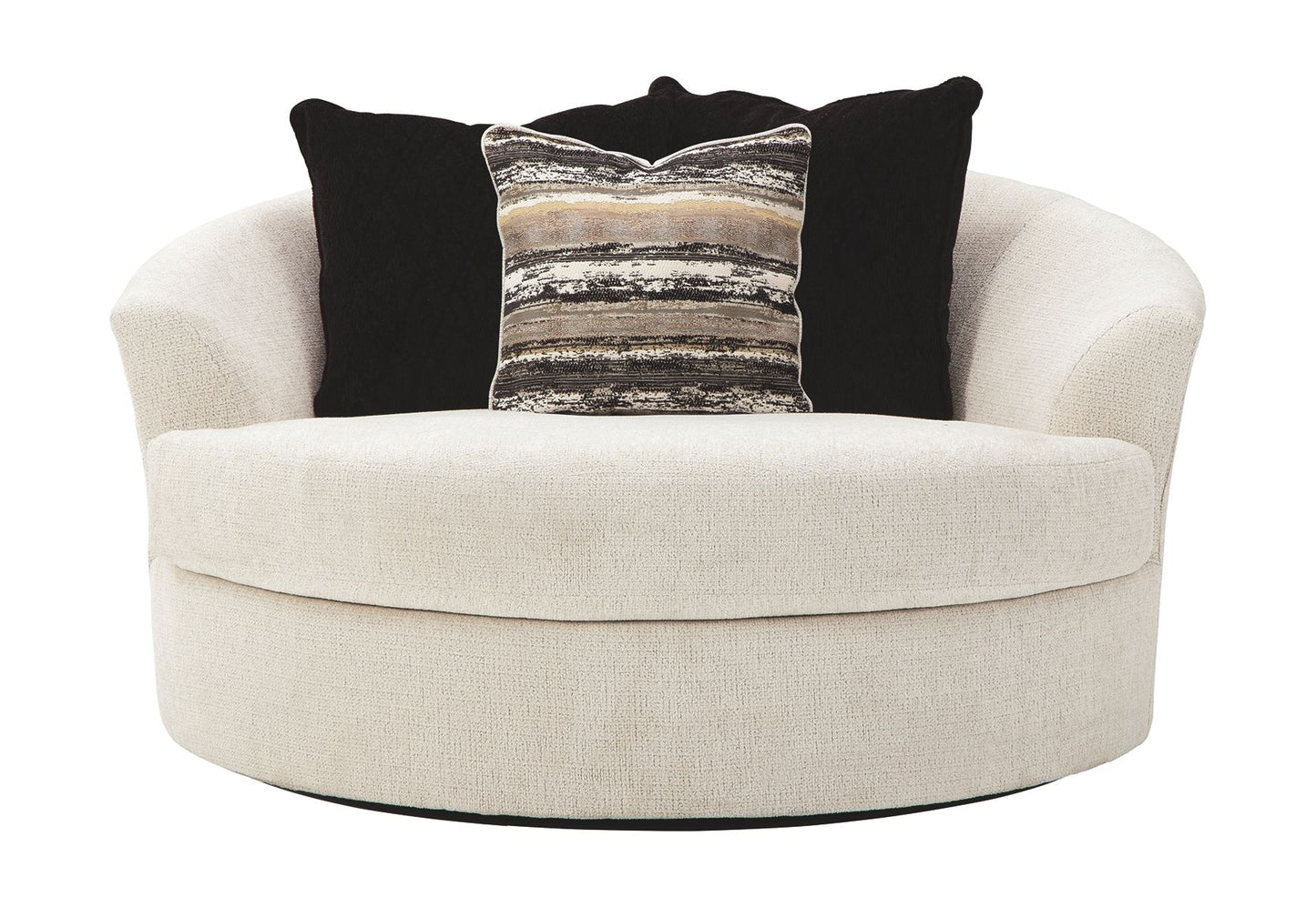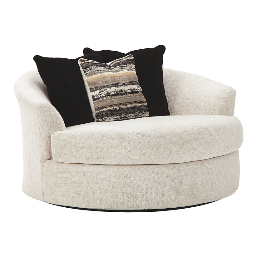 Let it snow. Doubling your pleasure with a spacious seating area with room for two—or just you—this oversized round swivel chair in a snow-tone neutral invites you to stretch your style in an easy-elegant way. Whether your aesthetic is urban hip or suburban chic, this posh swivel chair is sure to look and feel right at home. Wrapped in a chunky heavyweight chenille fabric with a delightful touch, this fashion-forward chair includes designer pillows for a brilliant pop of color and texture.