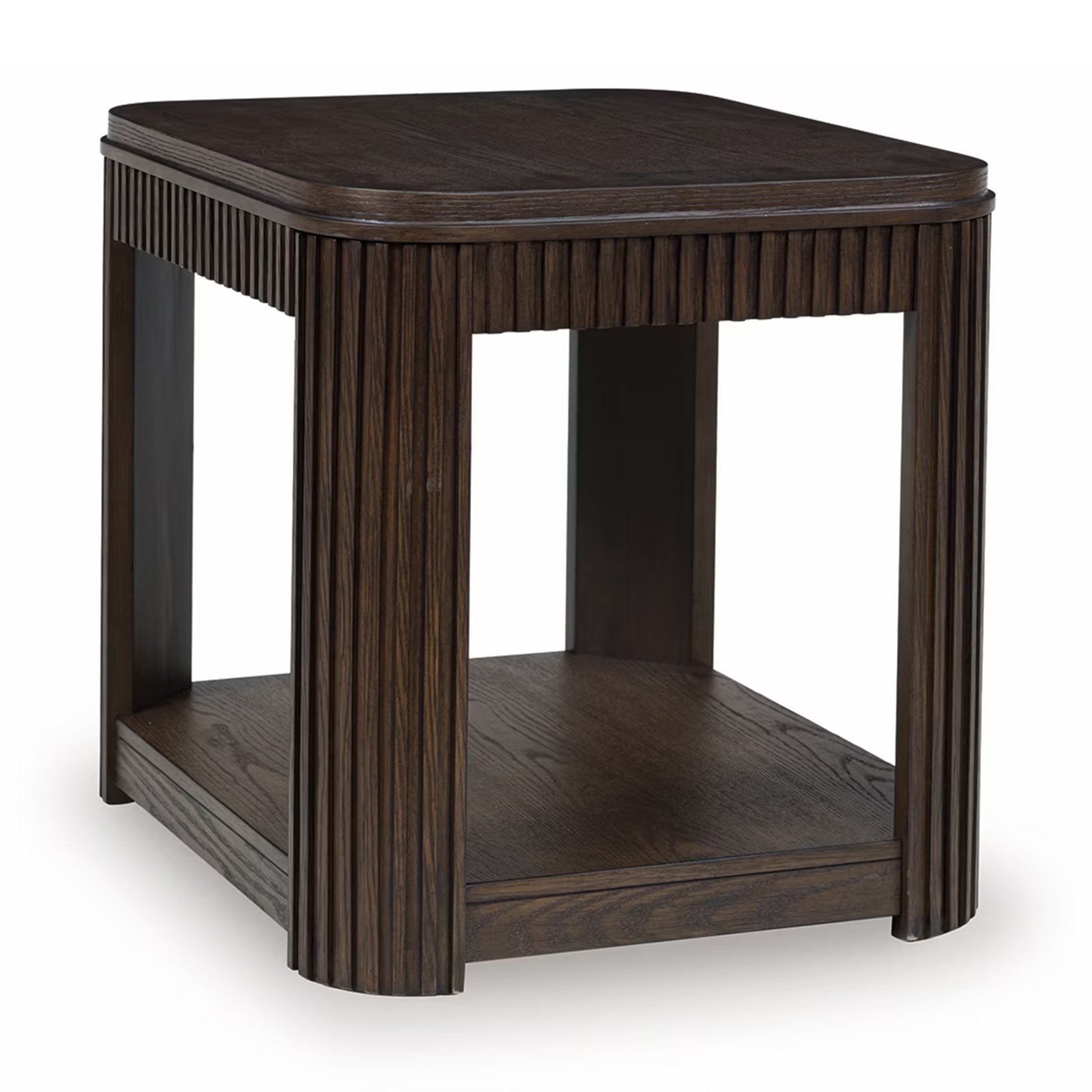 Cool, contemporary flair. Unbeatable function. This end table brings sleek style to everyday living. Fluted details on the apron and posts lend a trendy vibe. For a personal touch, dress up the lower shelf with your favorite decor.
