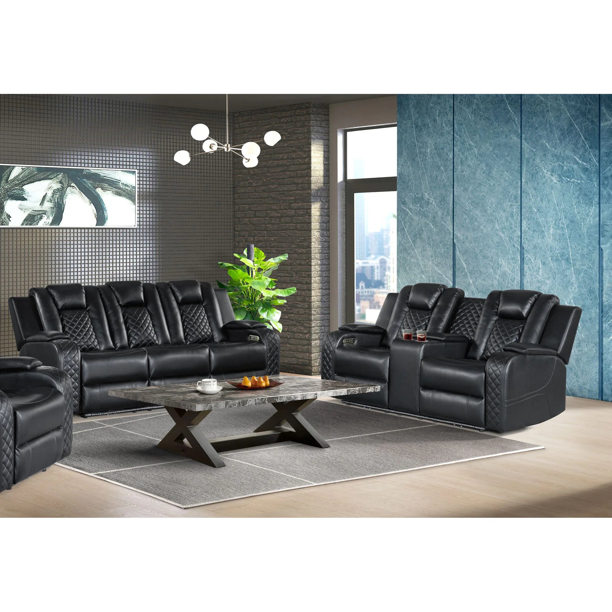 Upgrade your living room with the Carlo 2PC Living Room Set. This set includes a sofa and loveseat, both featuring power motion head recliners for maximum comfort. The loveseat also includes a convenient storage console with metal cupholders, while the sofa boasts a drop-down table with power outlets, cupholders, and reading lights. Hidden storage in the armrest, USB Type A and C outlets, LED under lighting, and foam-filled cushions with spring combination provide added functionality and comfort. The stylish diamond stitching adds a touch of elegance to your living space.
