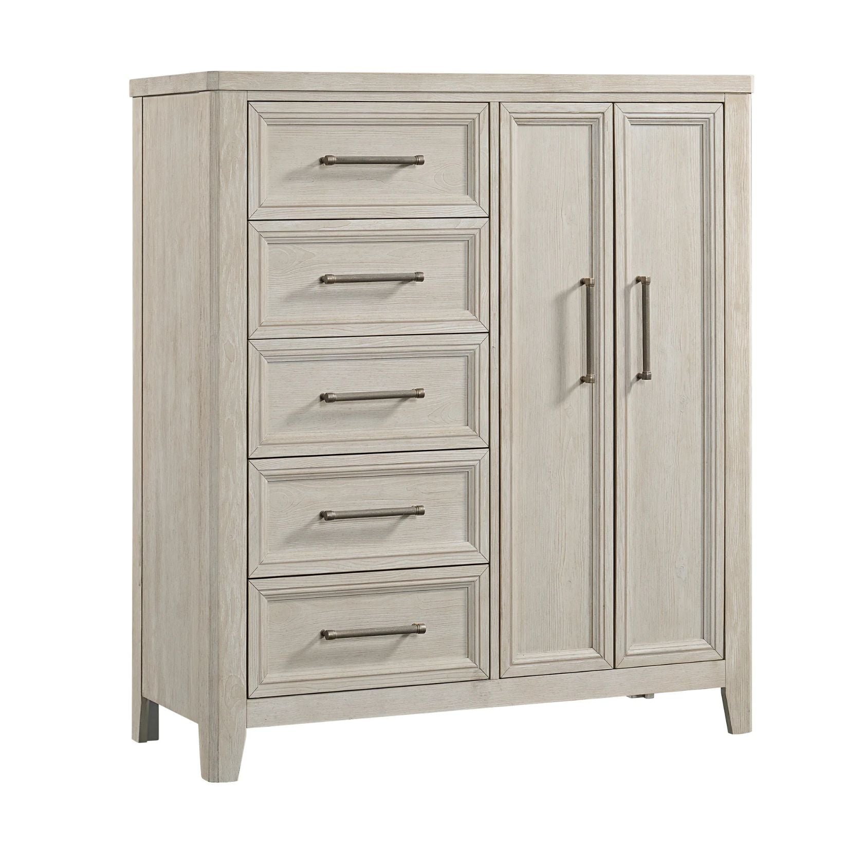 Carlson Bedroom offers transitional style blended with the casual nature of lightly wire brushed spruce solids and veneer. This larger scale group features thick solid wood tops, chamfered front posts, framed drawer, and door accents in a comfortable Washed Linen finish. The hefty bar pull hardware features a stylish antique pewter finish, to beautifully round out this collection.