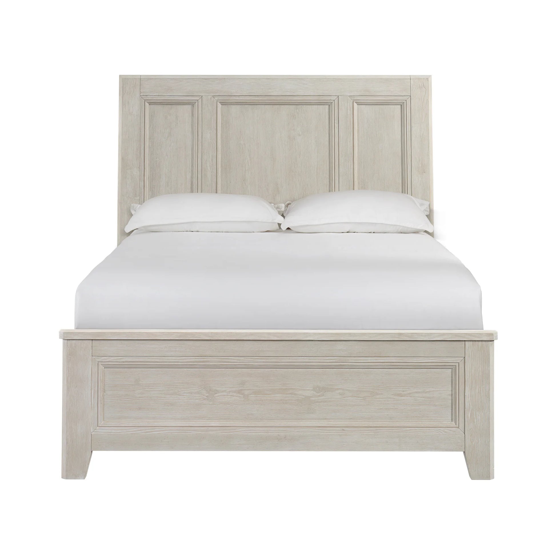 Carlson Bedroom offers transitional style blended with the casual nature of lightly wire brushed spruce solids and veneer. This larger scale group features thick solid wood tops, chamfered front posts, framed drawer, and door accents in a comfortable Washed Linen finish. The hefty bar pull hardware features a stylish antique pewter finish, to beautifully round out this collection.