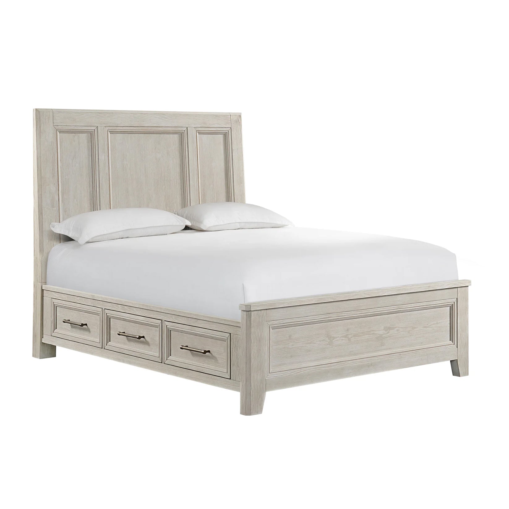 Carlson Bedroom offers transitional style blended with the casual nature of lightly wire brushed spruce solids and veneer. This larger scale group features thick solid wood tops, chamfered front posts, framed drawer, and door accents in a comfortable Washed Linen finish. The hefty bar pull hardware features a stylish antique pewter finish, to beautifully round out this collection.