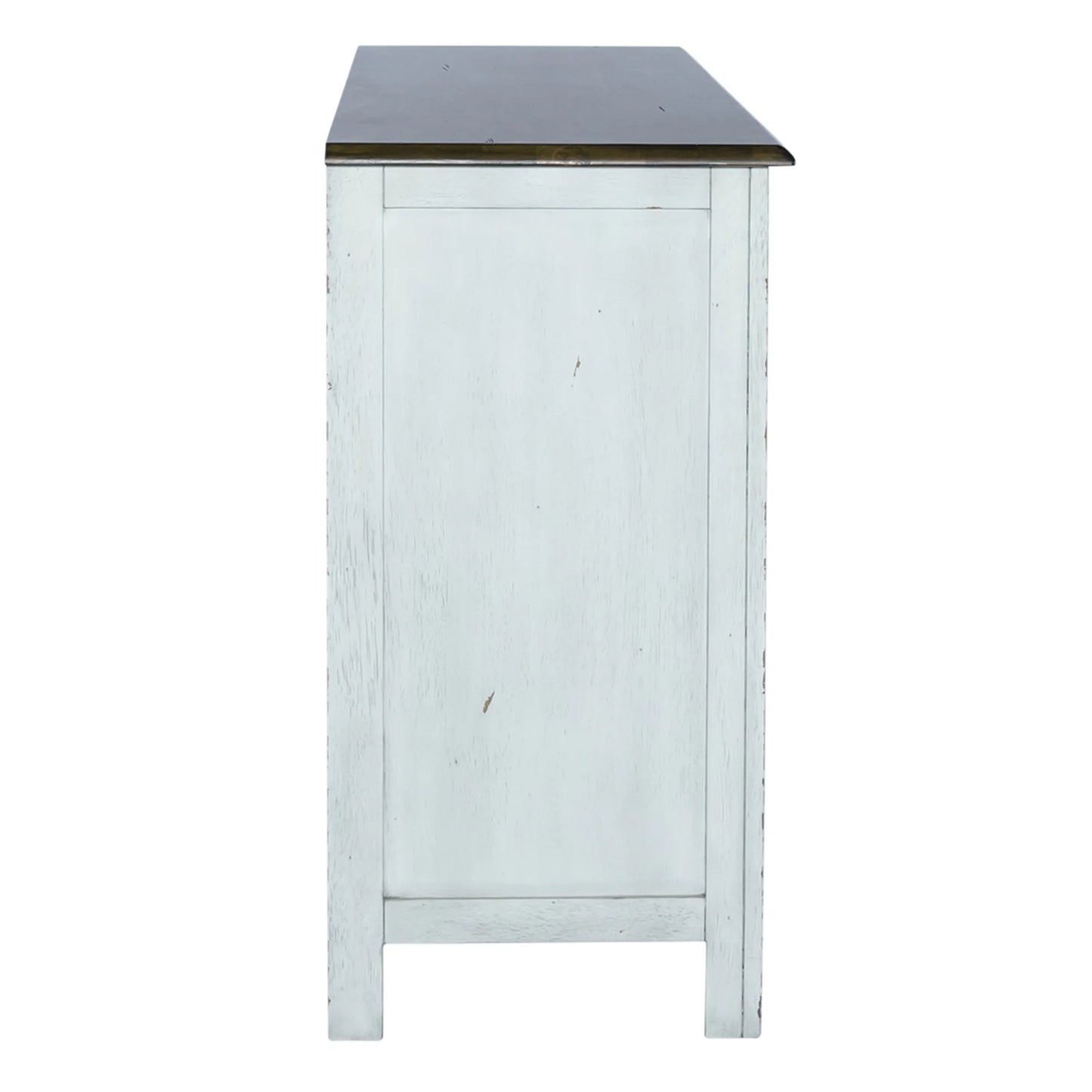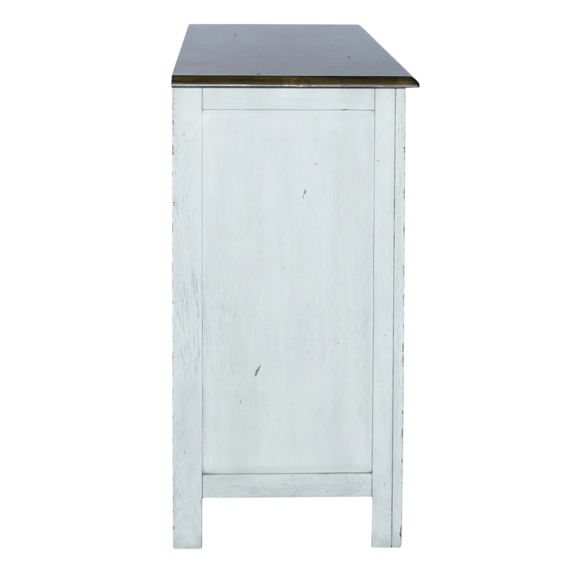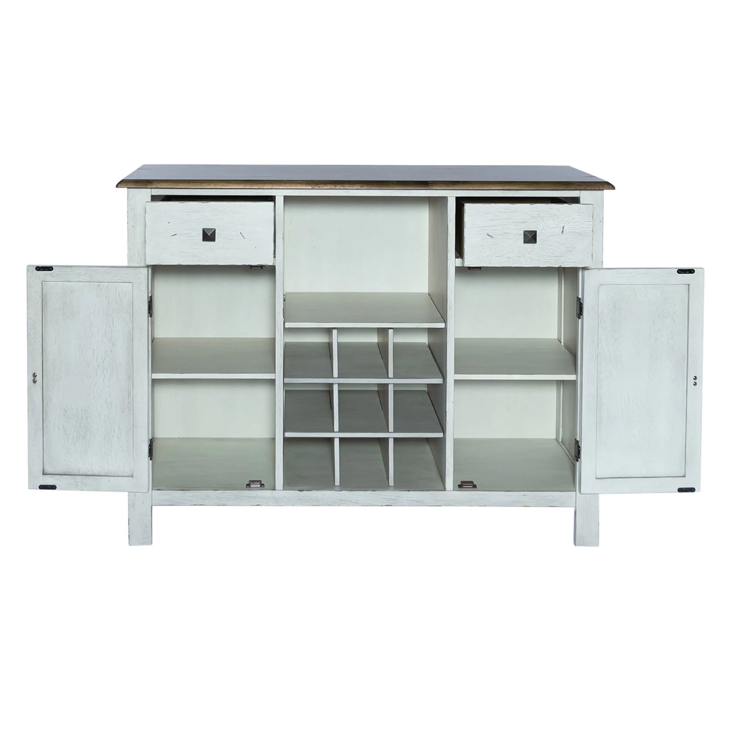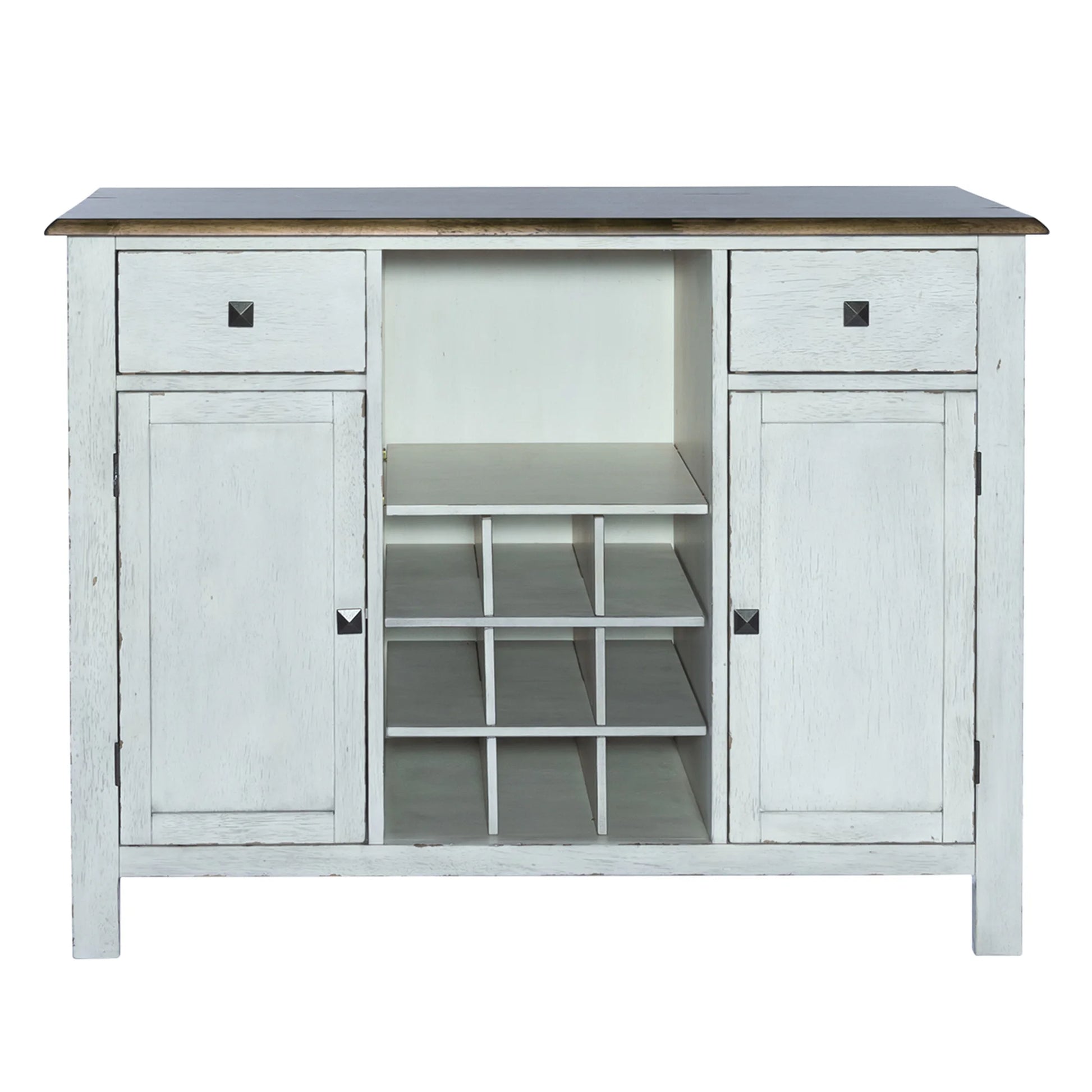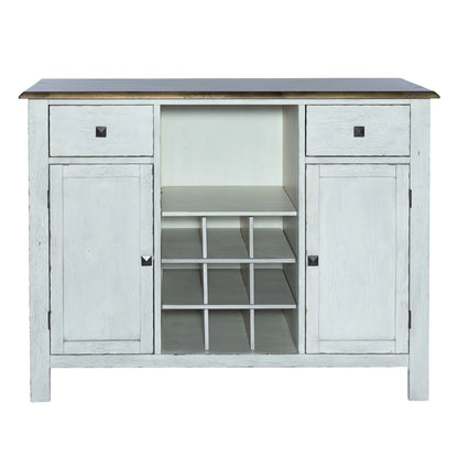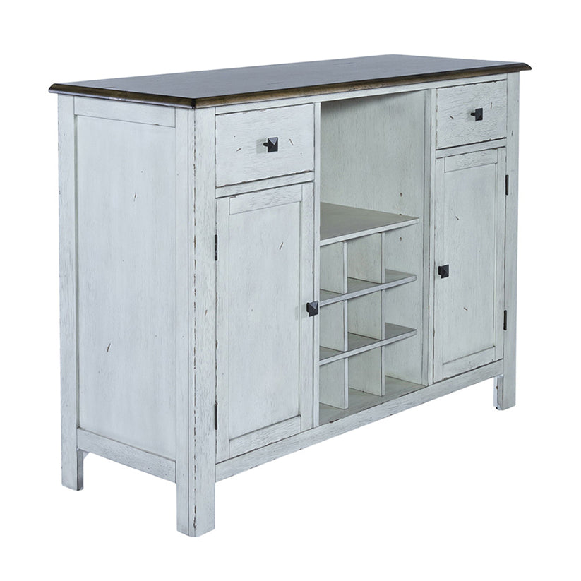 Enhance your space with the Carolina Crossing server in white. Crafted of rubberwood solids, this piece features a two-toned white and honey finish, bottom case dust proofing, two fully stained interior drawers, removeable nine bottle wine storage, two wood framed doors with an adjustable shelf behind each, and is accented by antique brass square knob hardware. This server is available in multiple finishes and the heavy distressing translates well into any decor.