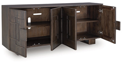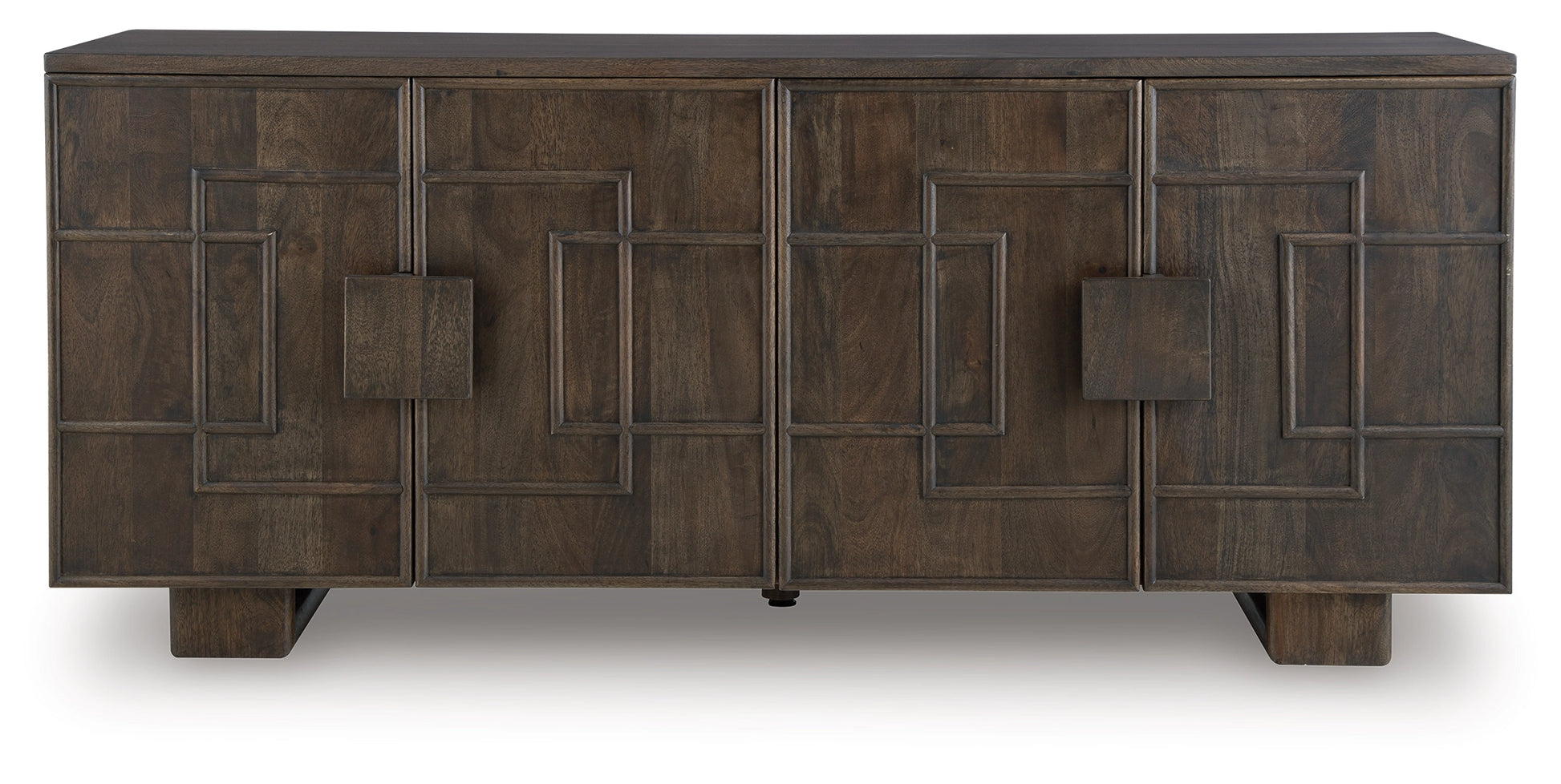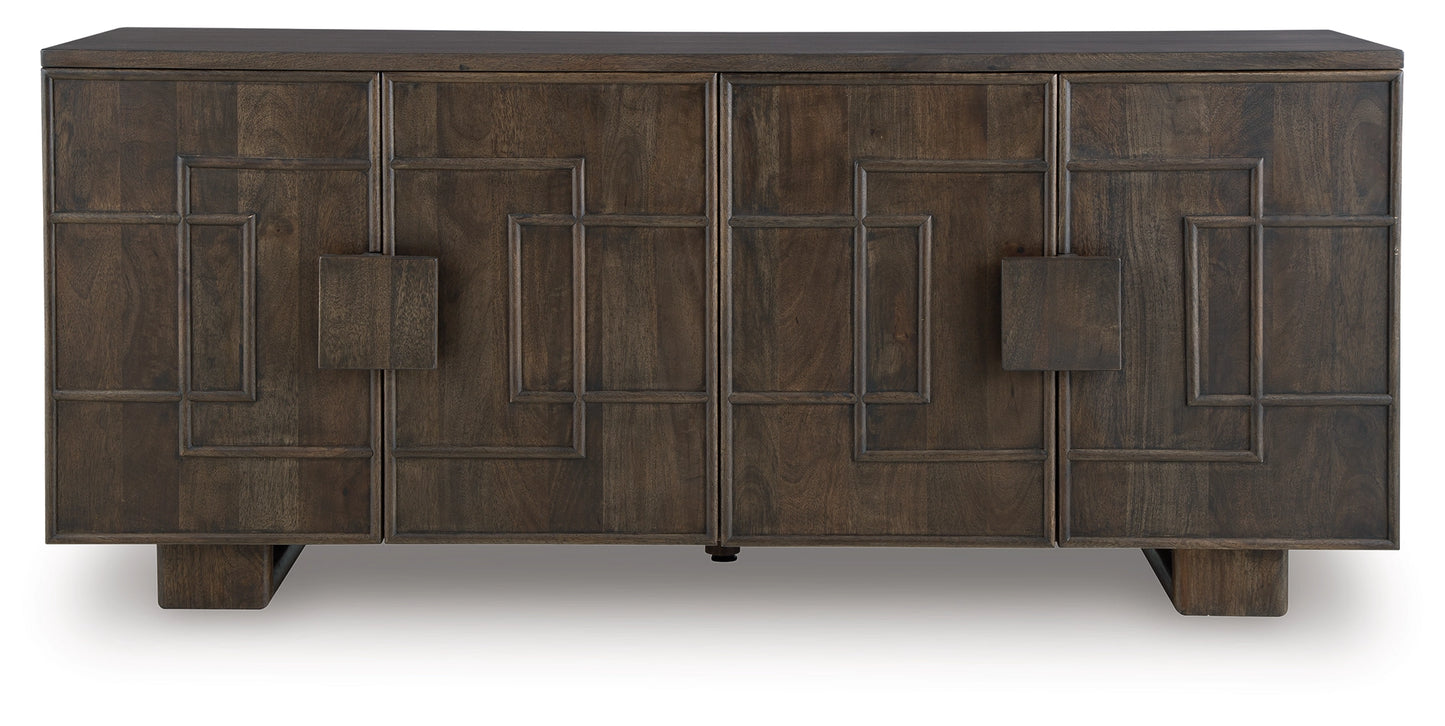 This accent cabinet is a stunning statement piece that combines artistry and functionality. A beautiful dark brown finish and raised geometric-patterned door fronts create a captivating look, while the spacious interior with two shelves offers ample storage. It's a perfect place to keep your essentials organized and out of sight.