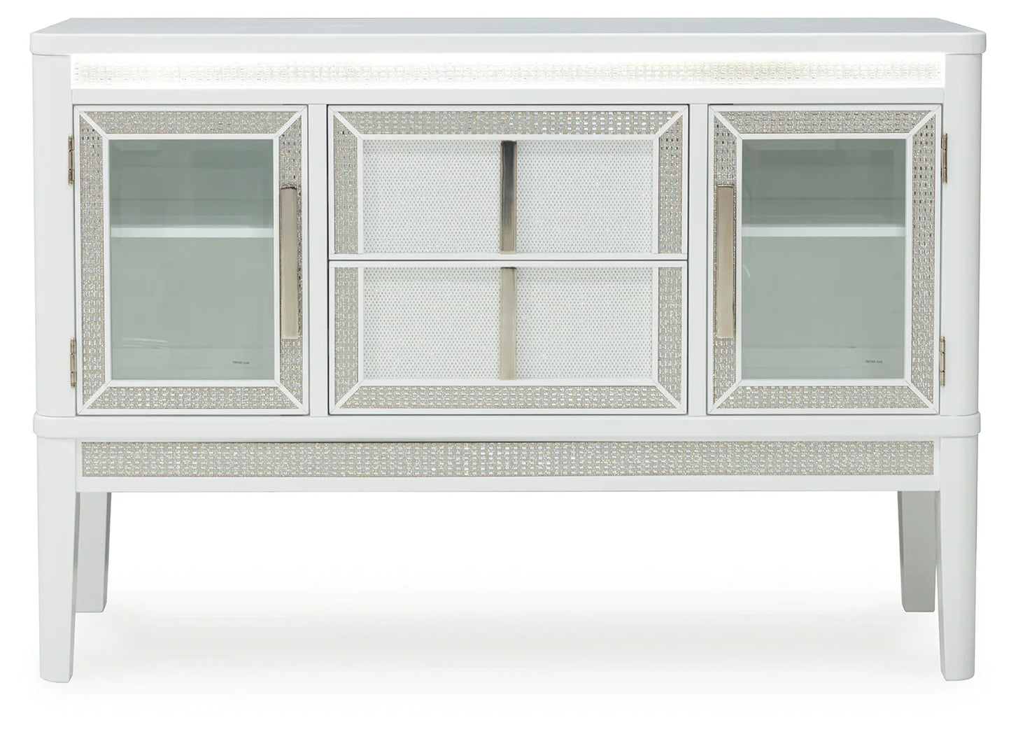 Embracing modern glamour, this server is a sparkling addition to your dining area. The bright white lacquer finish, shimmering rhinestone accents and glass panel doors give this piece plenty of polish. Discreetly placed along the upper valance, white LED lighting adds the perfect finishing touch.