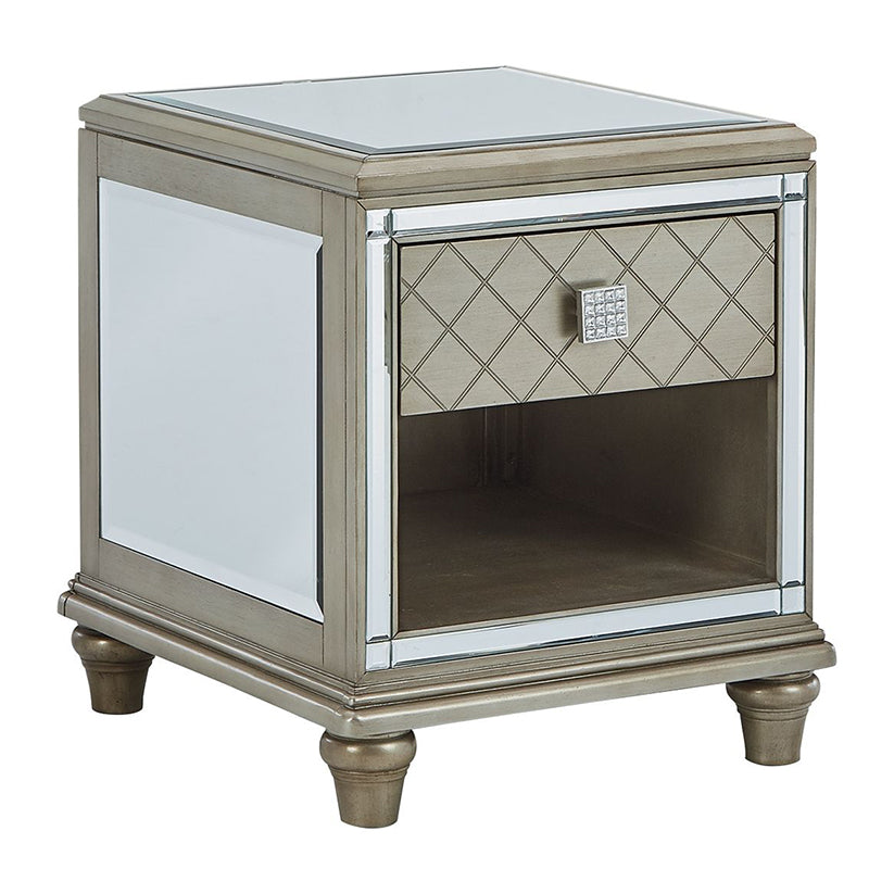 Glamorous, chic and sophisticated. This rectangular end table is made with a metallic silvertone finish, inset beveled mirror panels and drawer pulls adorned with faux crystals. No matter how you style it, this table is a stunning addition to your contemporary decor.