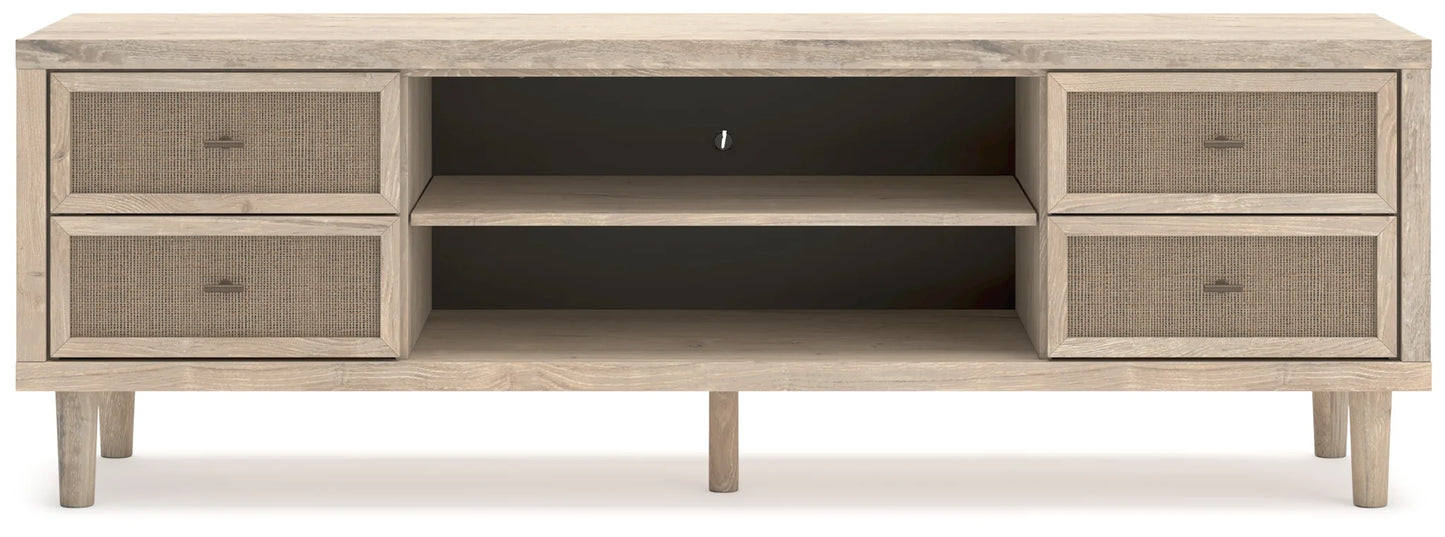 Clean-lined and contemporary—but far from stark—this TV stand is a fresh style awakening. Pairing a light finish with replicated oak grain and textured beige cane details, its mixed materials bring a naturally versatile vibe to your favorite spot for binge-watching or gaming. Sleek, simple hardware plays perfectly with the modern aesthetic. And prepare to have your mind blown by the vast universe of storage possibilities within the spacious drawers and open shelving.