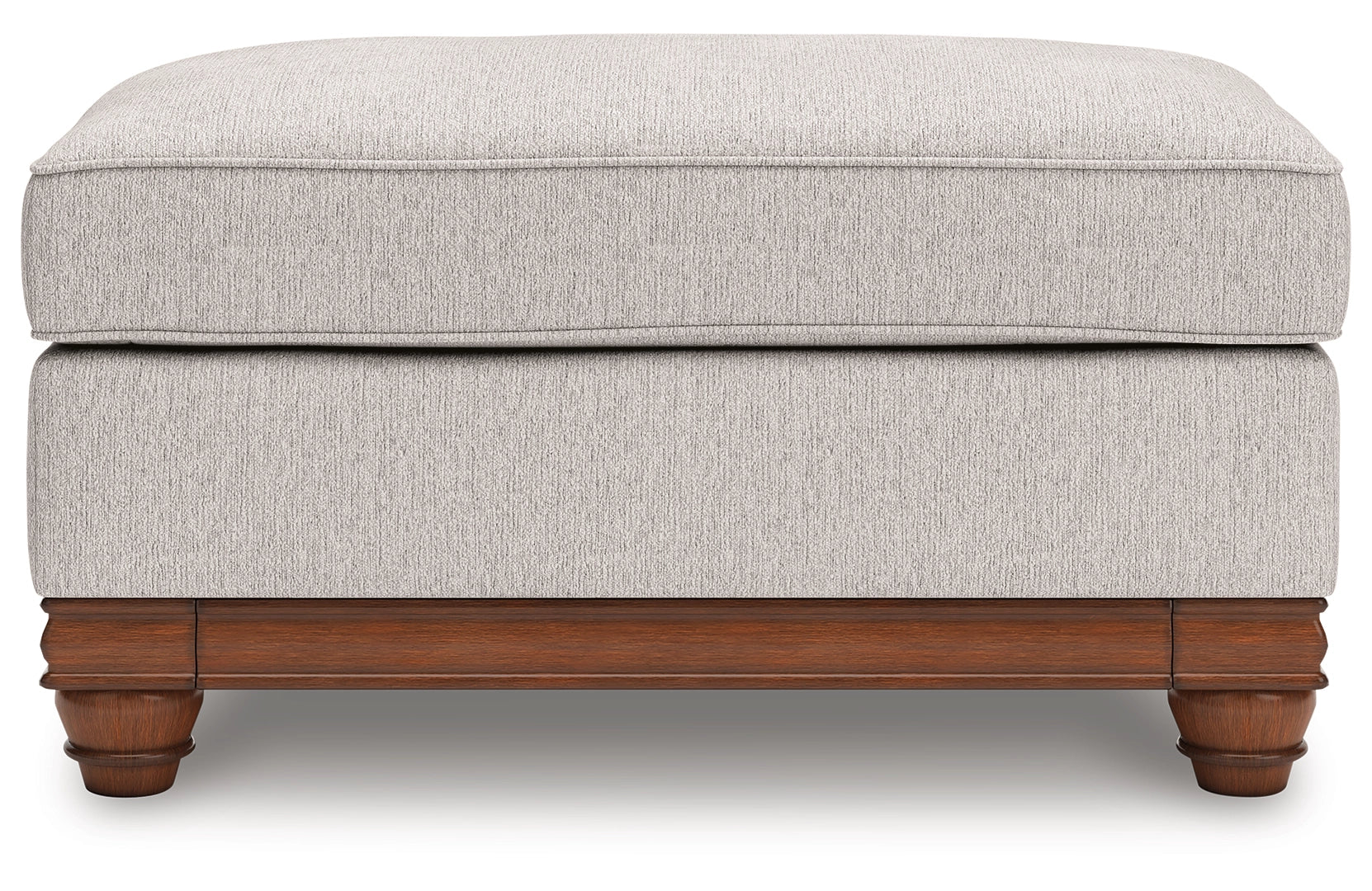 Fresh yet classic. That’s the beauty of this ottoman. Dressy and also soft to the touch, its organic neutral-toned upholstery is sure to bring a transitional farmhouse aesthetic to your living space. A full wraparound base and decorative legs complete the timeless look. It's the perfect place to kick up your feet at the end of a long day.