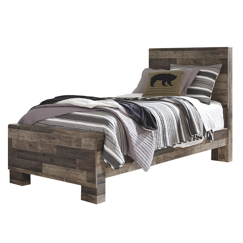 Modern yet hefty. This twin panel bed makes an urban eclectic statement. Seasoned raw wood look merges with the clean lined design we love today. Muted rustic finish over replicated pine grain maintains its authenticity for a beauteous look. Mattress and foundation/box spring available, sold separately.