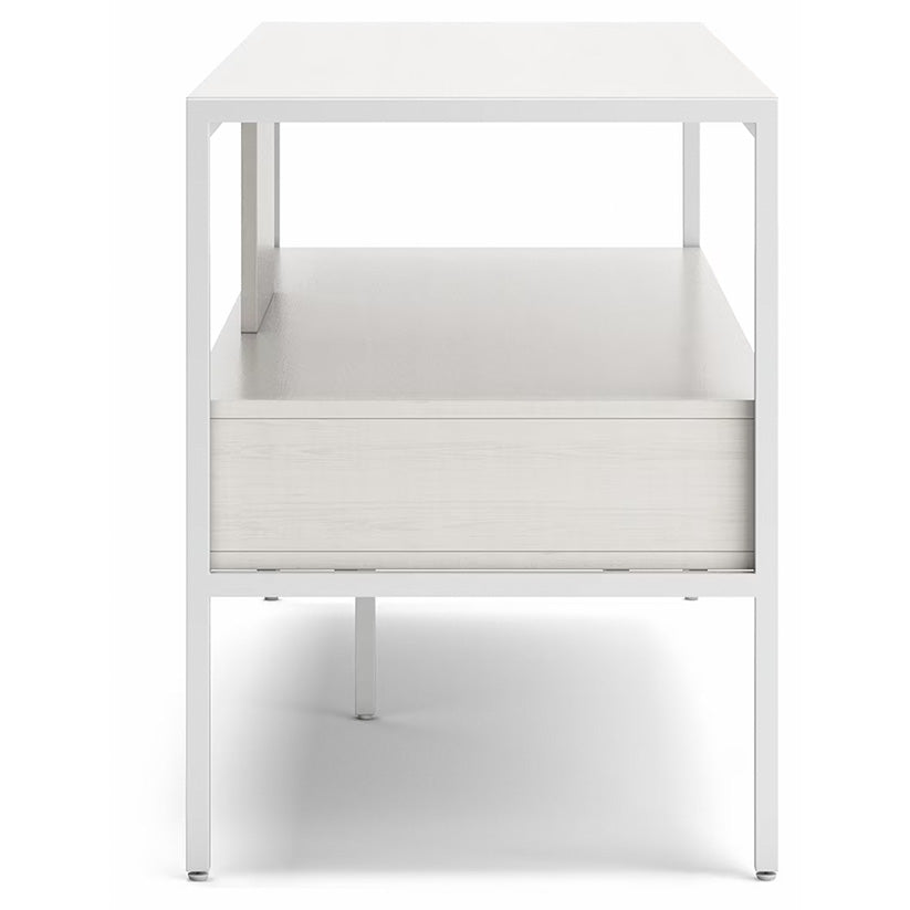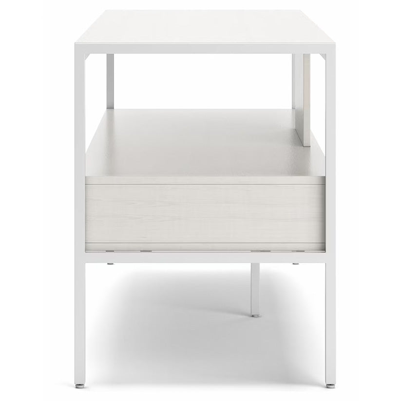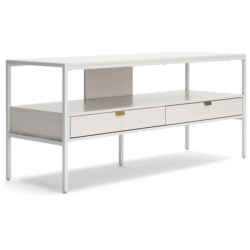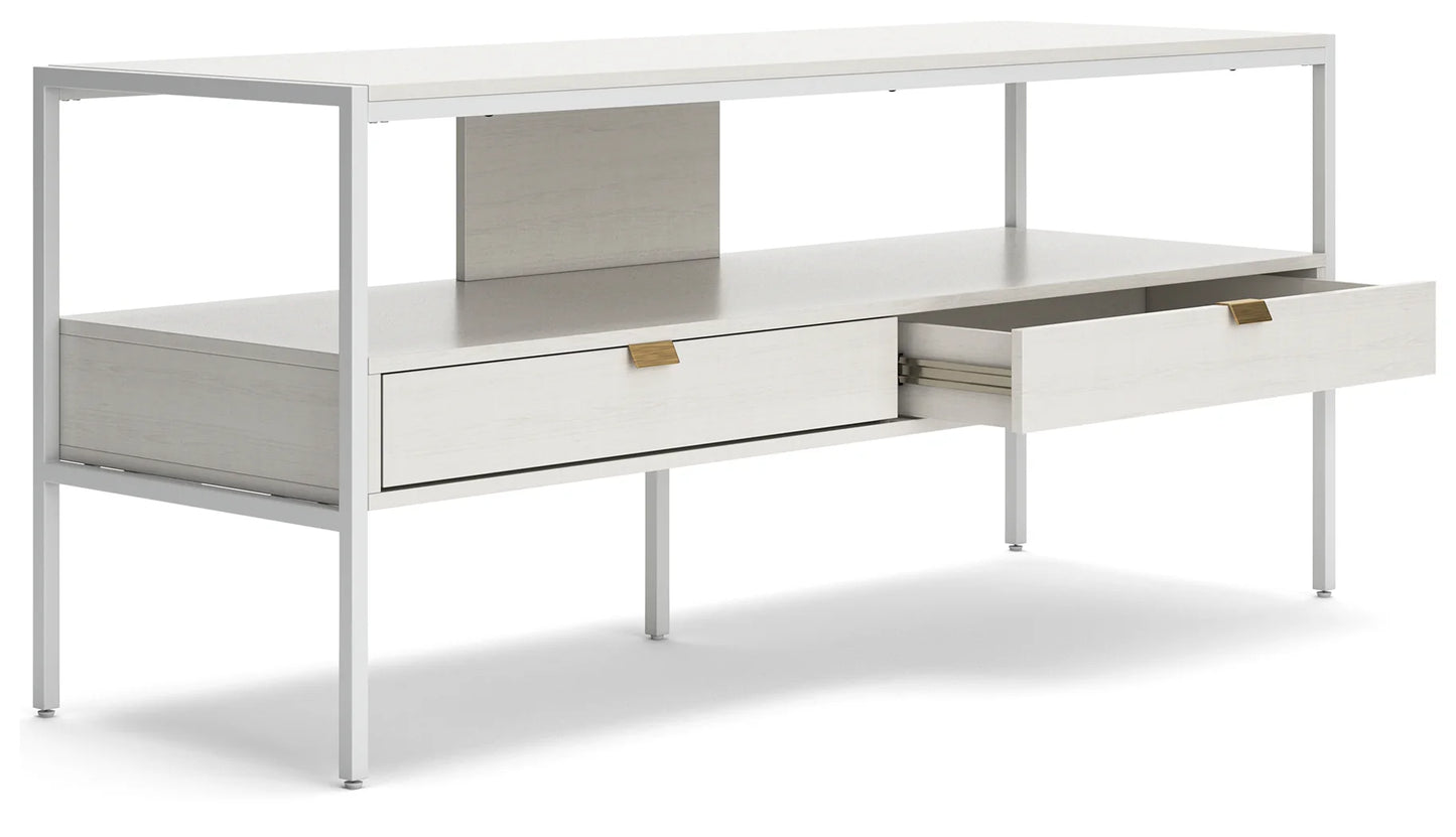 Bring your vision of a modern living room to life with this sleekly designed TV stand. Its linear construction and white finish keep things minimal. An open shelf and two drawers allow you to store in simply streamlined style, rounding out this versatile, striking piece.