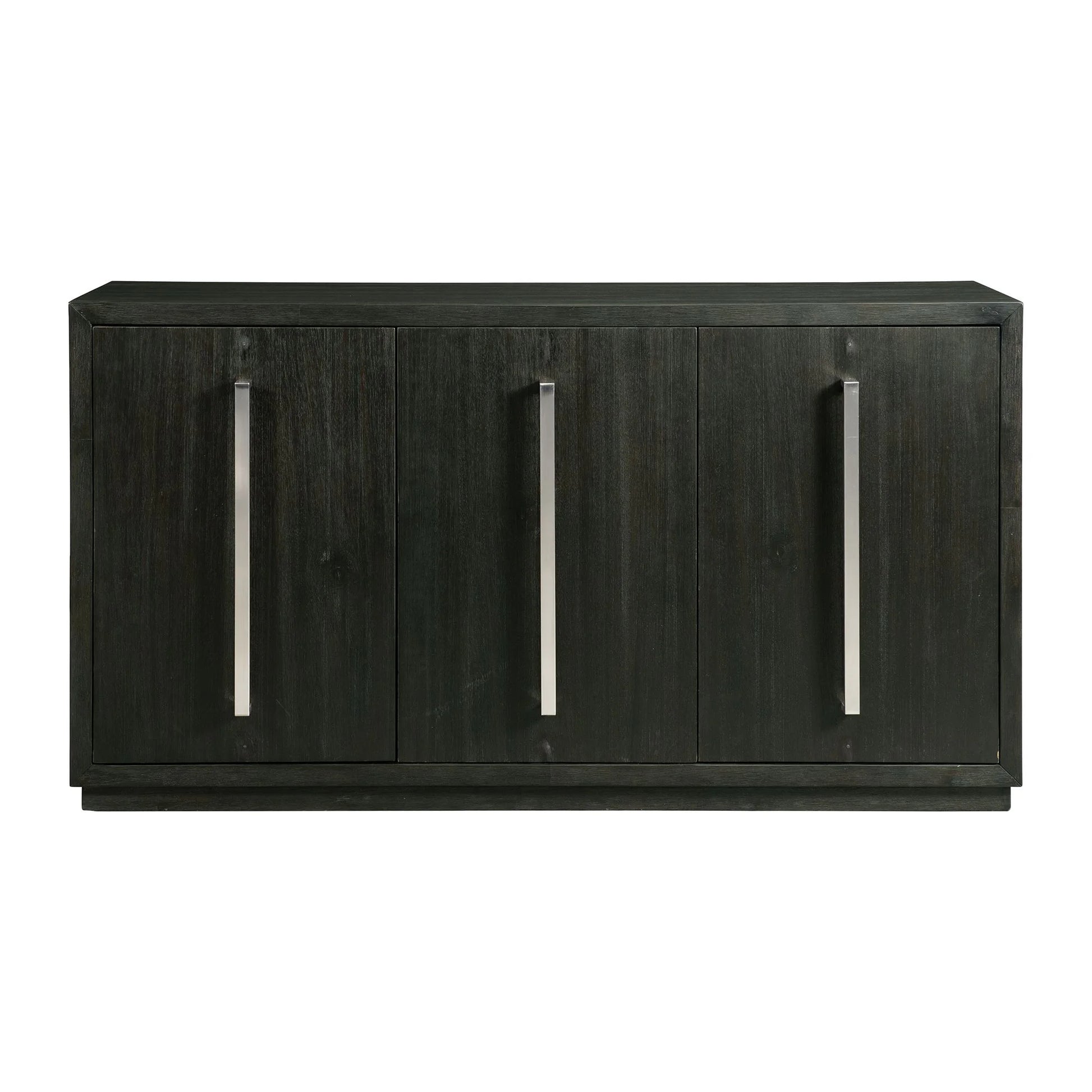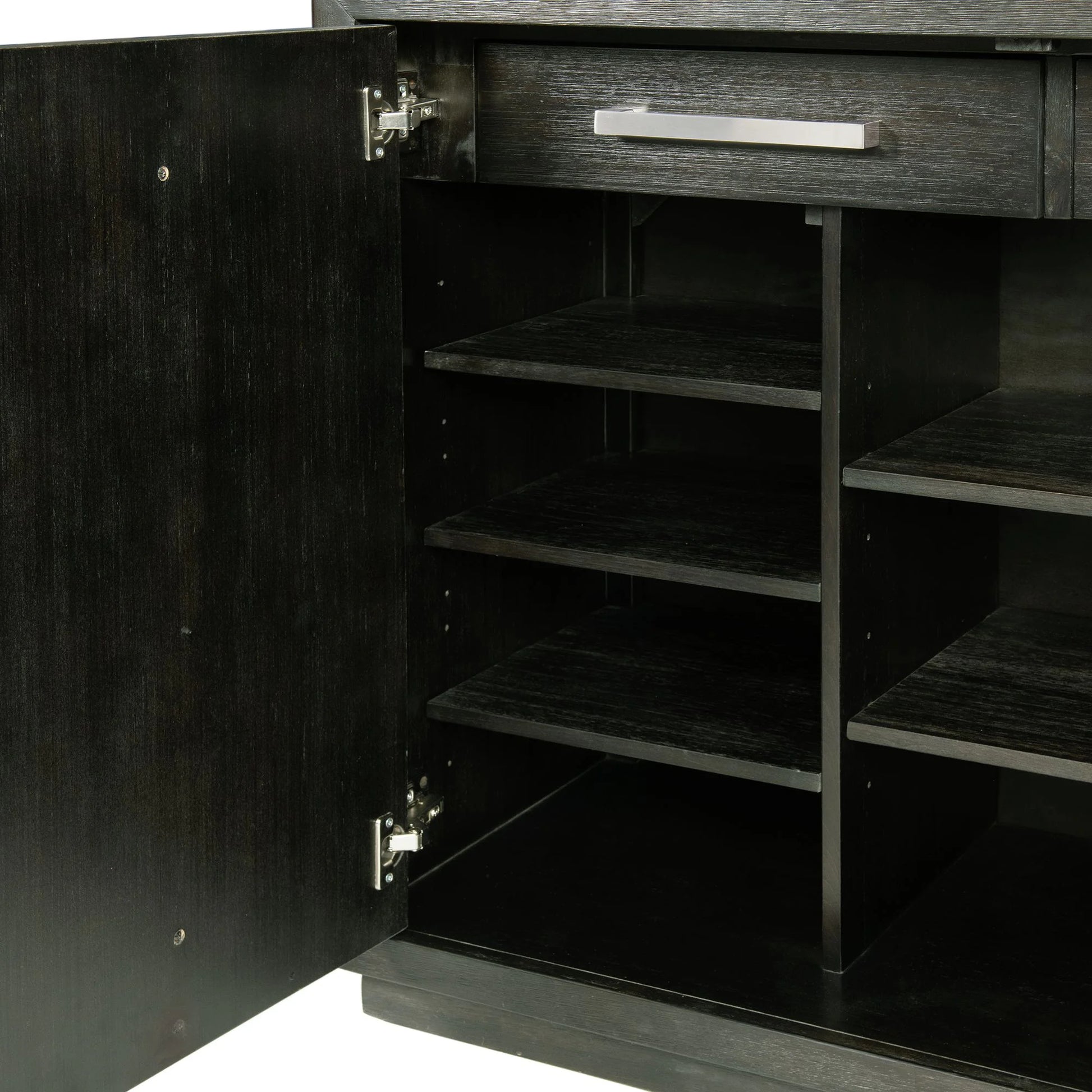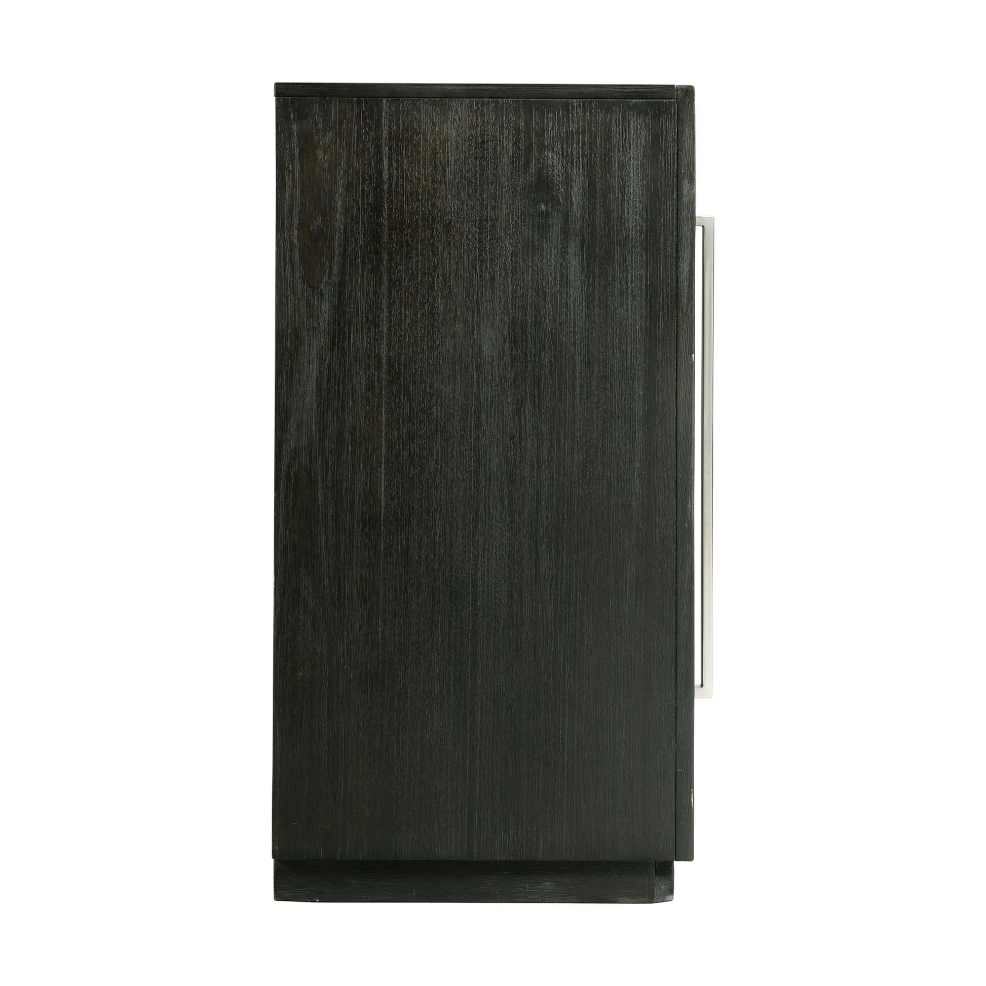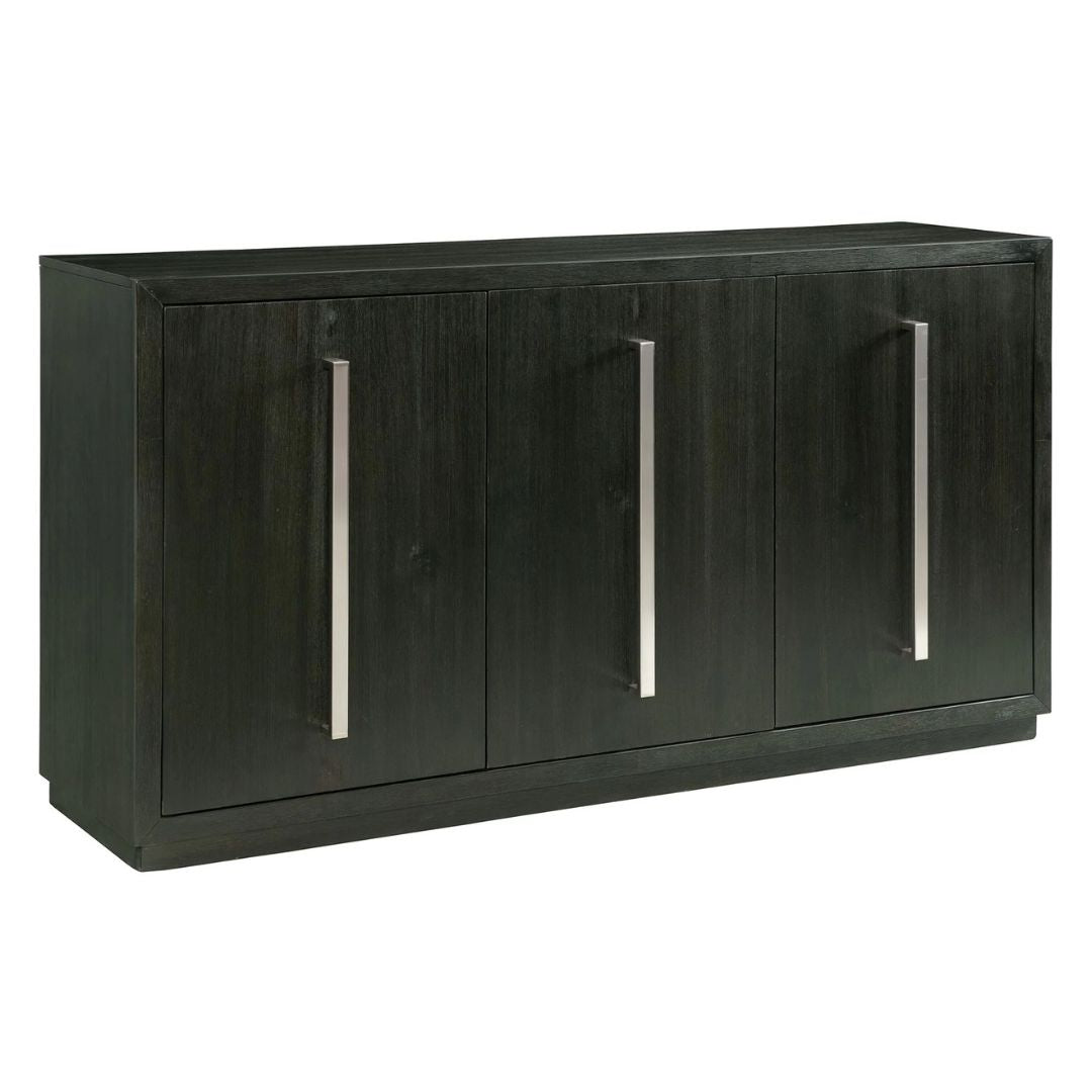 The Donovan Dining collection will be the key piece to your dining room. The server is a showstopper featuring its clean lines and dark finish. The piece features a generous amount of storage space on the shelves and beautiful cabinet doors with contrasting chrome hardware for a dramatic design. This is a effortless modern look for your dining room.