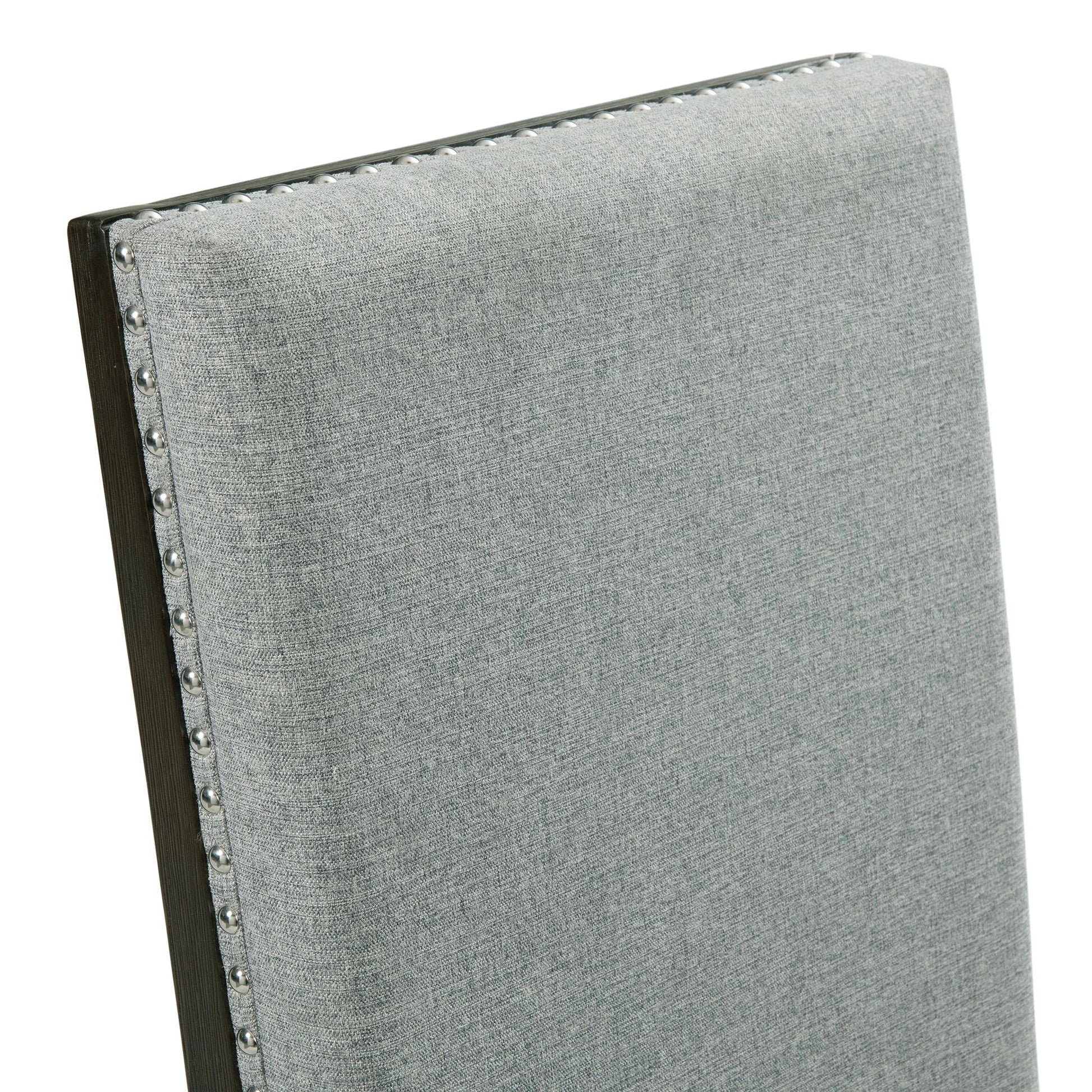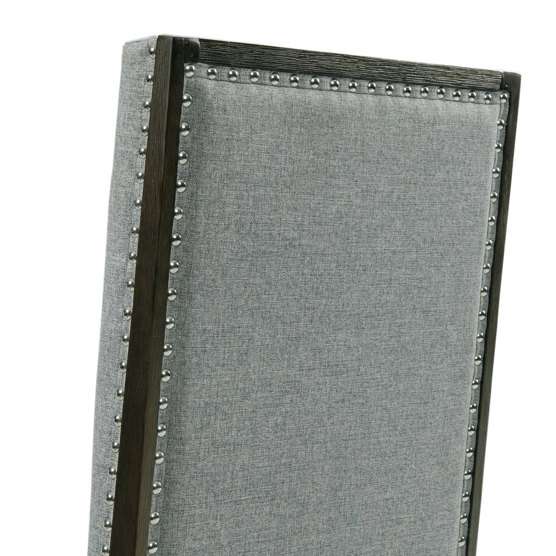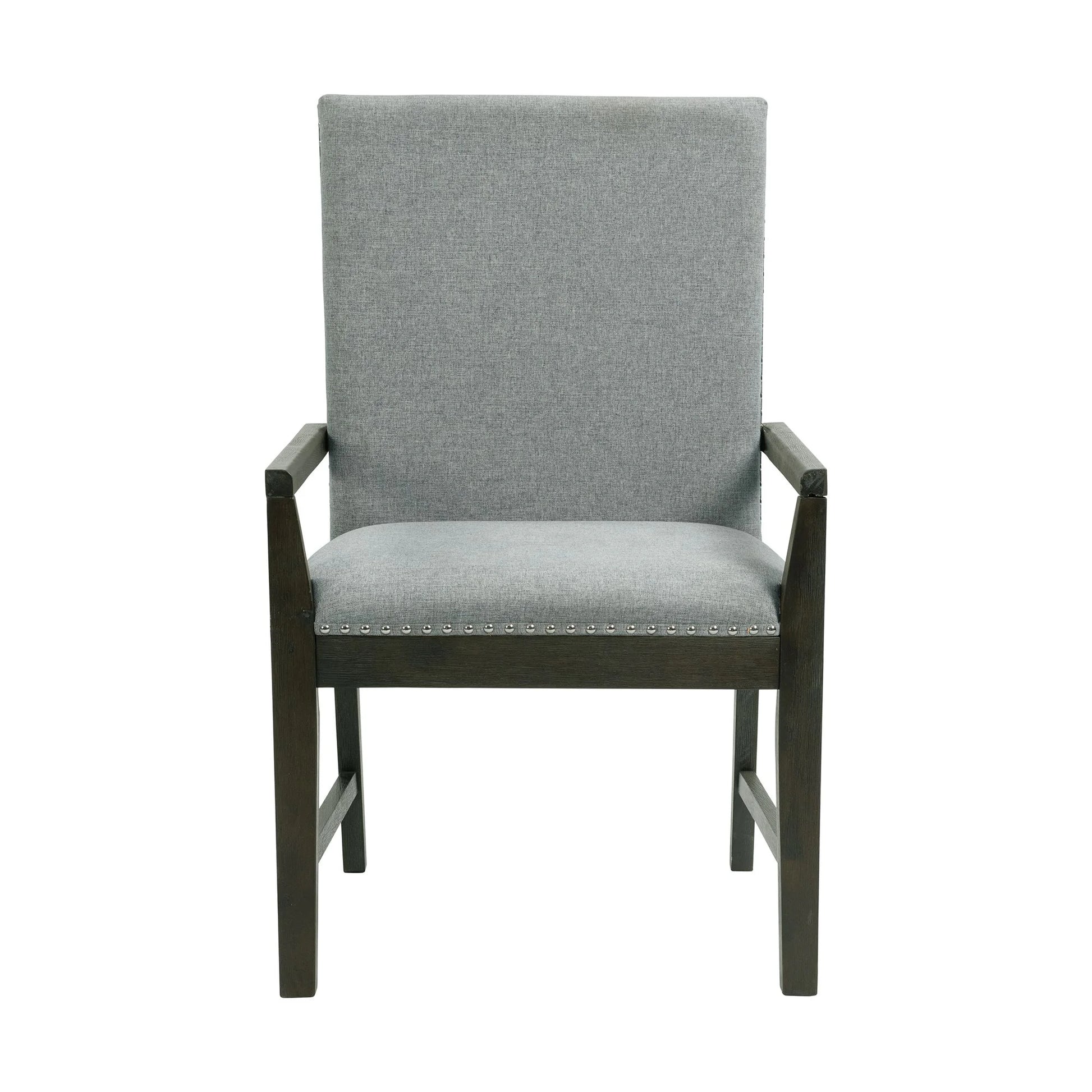 The Donovan Standard Height Arm Chair Set in going to look fantastic in your home! This set comes with two, dining room chairs. These chairs are upholstered in a gray fabric, that pairs beautifully with the black, wire brush finish on the legs and arms. Chrome nail head trim, outlines the edges of the chairs, instantly adding extra flair to this already stylish pair. The solid chair back is classic in design and will provide hours of comfort thanks to its foam cushioning. Add these stunning chairs to your dining table today for a look you'll love day after day!