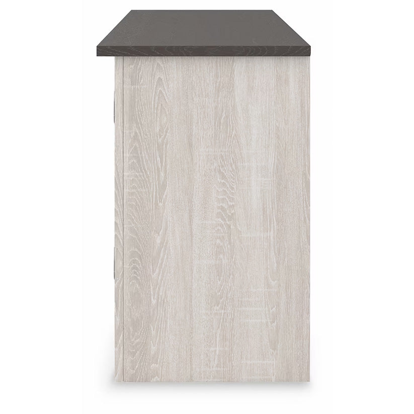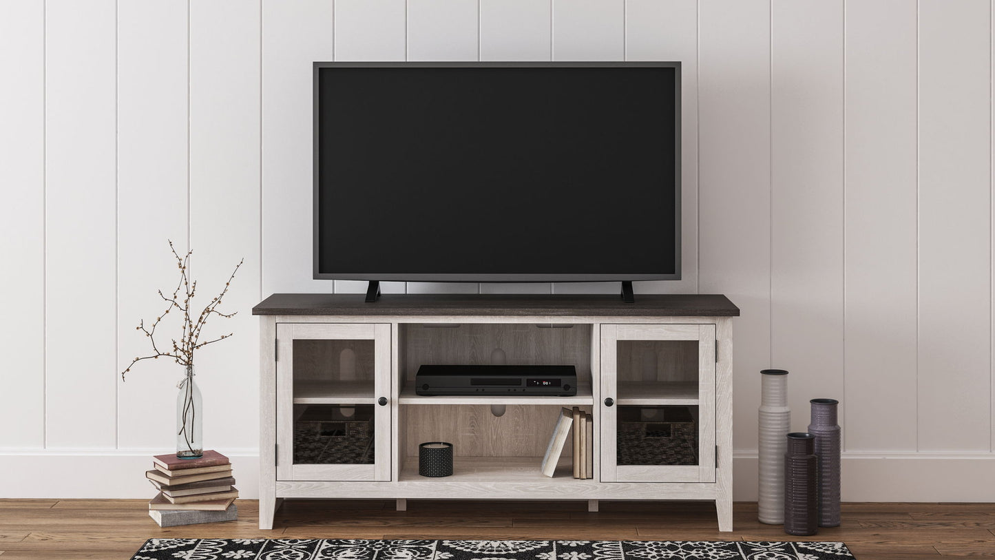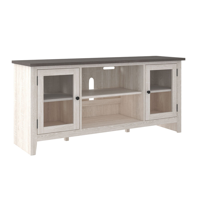 With its two-tone finish and minimalist charm, this TV stand with fireplace option is right in tune with your relaxed approach to high style. Beautifully made to accommodate your media equipment, it’s well equipped with adjustable shelving, cutouts for wire management and a pair of glass-front doors that enhance the clean-lined aesthetic. The look is ideal for modern farmhouse and contemporary settings.
