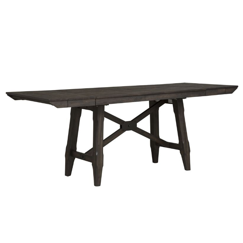 Gather the family around the Double Bridge trestle table set. Crafted of rubberwood solids and acacia veneers, this set consists of a trestle table base and top and features a dark chestnut finish with wire brushing, two 12-inch leaves, one for each end of the table, to accommodate guests or a larger family, and an easy glide track system for added convenience. The Double Bridge Dining defines the rustic side of casual. The sleek design is optimal for any space.