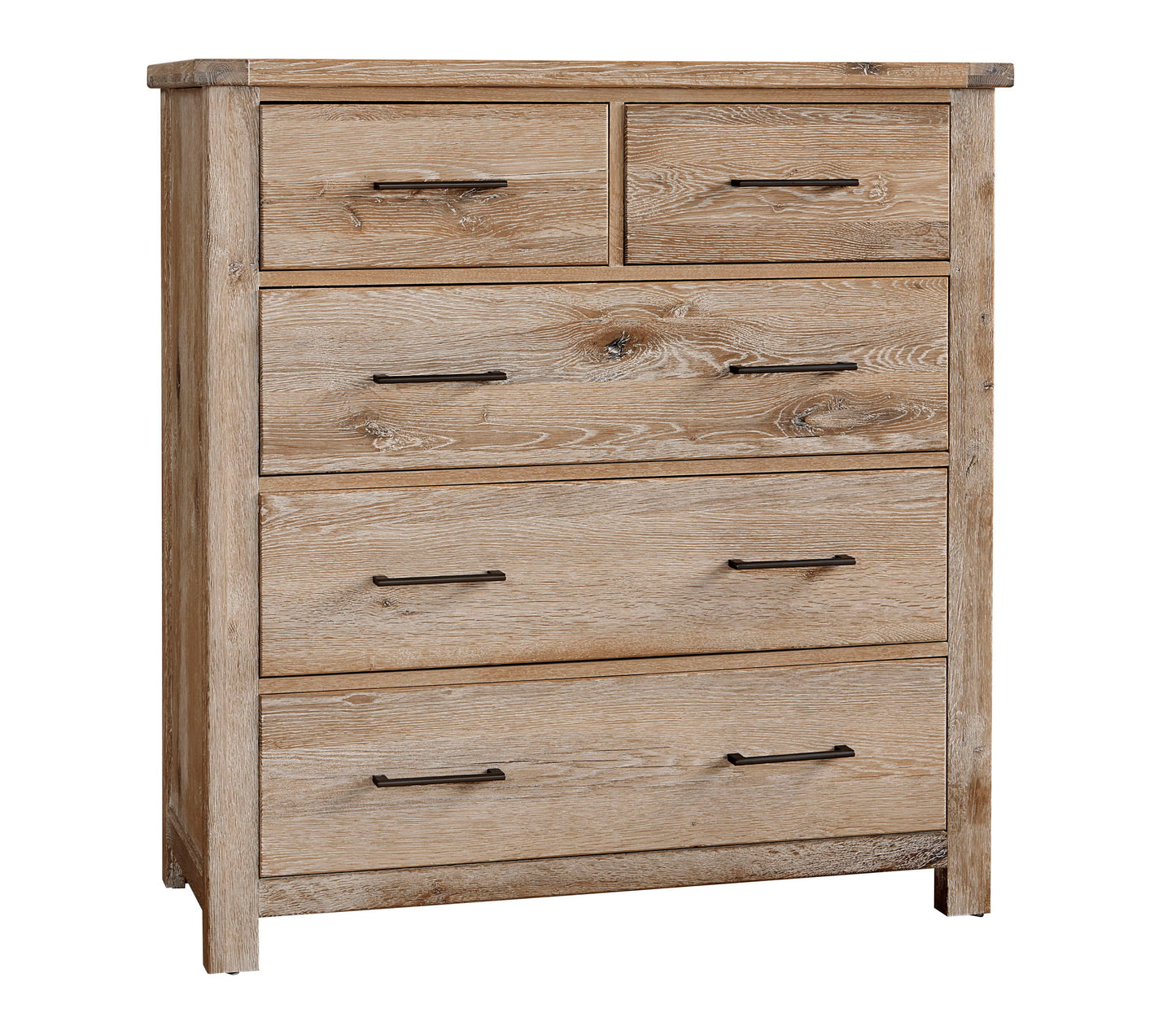 MADE IN USA - Vaughan Bassett - All produced and stocked in Galax, VA; by approximately 600 skilled craftsmen and craftswomen. Collection: Dovetail - This collection takes rustic furniture to the next level. It is produced from White Oak Solids and Solid White Oak Veneer. Vaughan Bassett has develped a process that allows them to accelerate how wood ages and thus gives a very natural reclaimed wood appearance. They have also incorporated a Dovetail joint; which joins the bed posts to the headboard and footboard as well as dresser, chest and night stand tops. This versatile collection has two outstanding beds in both Queen and King sizes. The signature bed is the Dovetail bed with the fabulous 6 X 6 footboard. Four terrific finishes; Java, Mystic Gray, Sun Bleached White and Natural. Through an innovative program with the Virginia Department of Forestry, Vaughan Bassett replaces every tree used to produce its furniture. Over the last 10 or so years; 1.5 million trees have been planted.