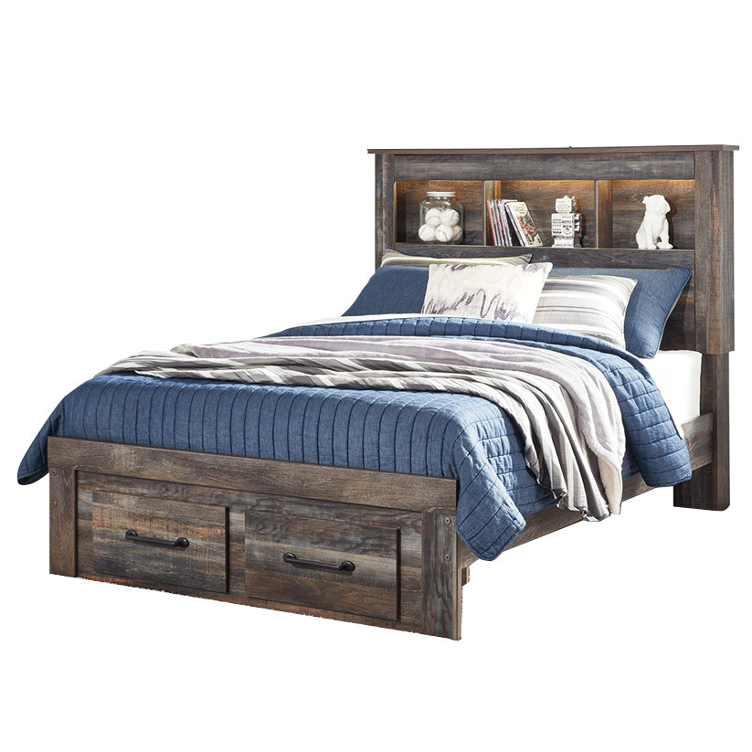 When merged in just the right way, rustic and industrial styles can make one happy marriage. Case in point: this full bookcase bed with storage. A refined take on barn board beauty, its complex, replicated wood grain showcases hints of burnt orange and teal tones for a sense of weatherworn authenticity. Three open cubbies lined with a dimming LED light strip keep bedtime reads top of mind. Double drawers at the foot of the bed come in mighty handy.