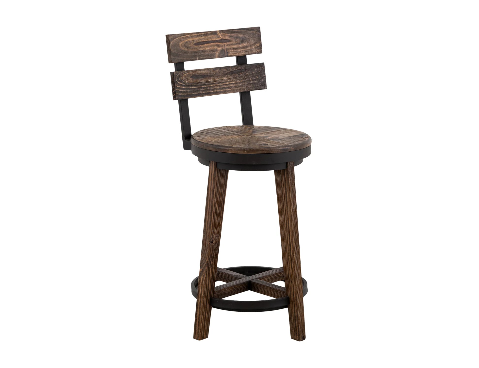 The Dutton stool collection uniquely combines rustic and industrial design elements. Its round seat, made from various wood species, features a natural wood grain that adds warmth. A metal trim around the edge enhances durability and adds a modern touch. The metal footrest encircles the four sturdy wooden legs, providing stability and comfort. This stool is a practical and charming addition to any rustic, contemporary, or industrial space.