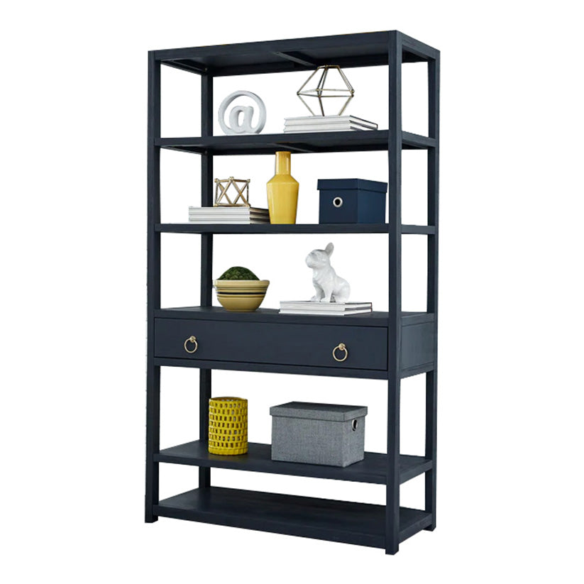 Turn your house into a home with the eclectic East End accent bookcase. Crafted of Acacia Solids and veneers, this piece features a wire brushed Denim finish accented with brass ring hardware. This bookshelf offers six shelves for storage and display as well as a full extension drawer for additional storage. This piece is versatile enough to work in any room and transform the ordinary into the extraordinary. Unique and timeless, allow the East End accent bookcase to bring inspirational design into your home.