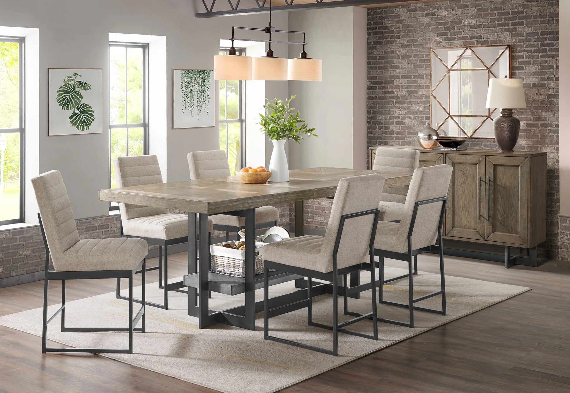 The Eden Dining Collection features an oak veneer and select hardwood construction, including rubber-wood, poplar, and maple with a beautiful wire brushed urban rustic “Dune” finish. This unique industrial dining collection offers a modern style, designed for ultimate comfort. A self-storing leaf and cable driven metal slides provide optimum functionality for day to day use.