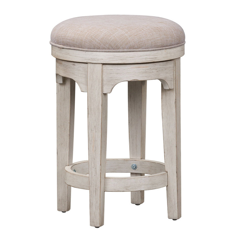 Add a touch of class and style with the Farmhouse Reimagined console swivel stool with upholstered padded seat you could sit comfortably for hours. Feature tapered solid poplar wood legs in a heavily distressed antique white finish.