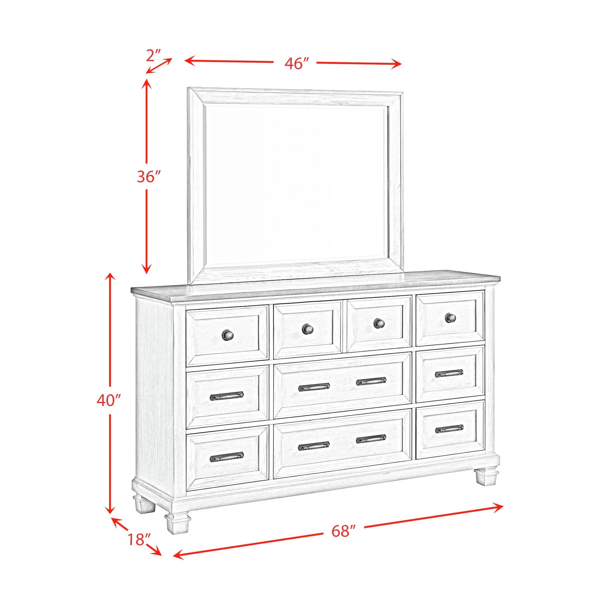 The Farmington Dresser and Mirror Set are beautifully designed pieces of furniture constructed of poplar wood with acacia veneer. The dresser boasts a stylish two-tone design in medium brown and washed stone that will complement any bedroom decor. It also features a convenient jewelry tray, top drawers with brown felt lining, and cedar lined bottom drawers for ample storage space. Complete with handle and knob metal hardware, ball bearing drawer guides, and French and English dovetail construction, this set is not only stylish but also functional. The anti-tipping kit adds extra safety measures to these beautiful furniture pieces. Upgrade your bedroom with the Farmington collection today!