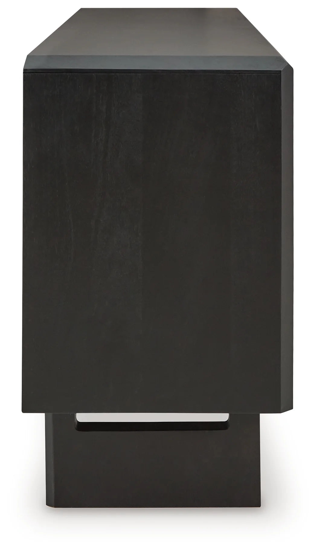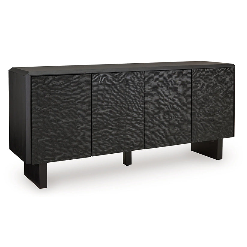 Function and style merge perfectly with this accent cabinet. Crafted of solid wood in a black finish, this piece makes a great case for fresh contemporary design. Doors with a carved pattern open to reveal shelving, while beveled edges add a distinctive touch. Whether you use it for storage or as a TV stand, your love of unique style will shine front and center.