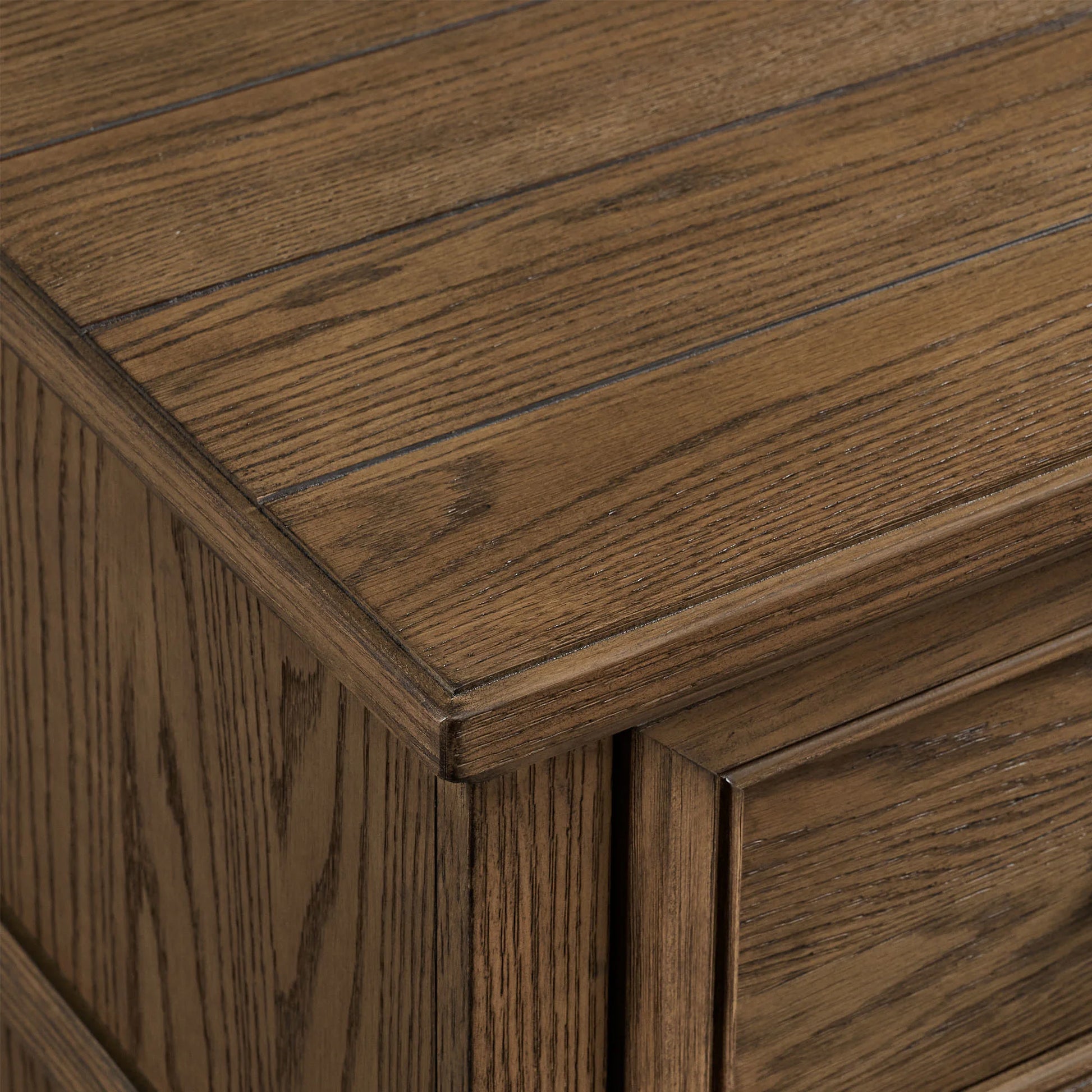 The Forge Bedroom Collection features Oak Veneer and Select Hardwood constructions in a wire-brushed Weathered Chestnut finish. With detailed metal accents and hefty hardware, this trendy chestnut bedroom set will add warmth and style to any bedroom.