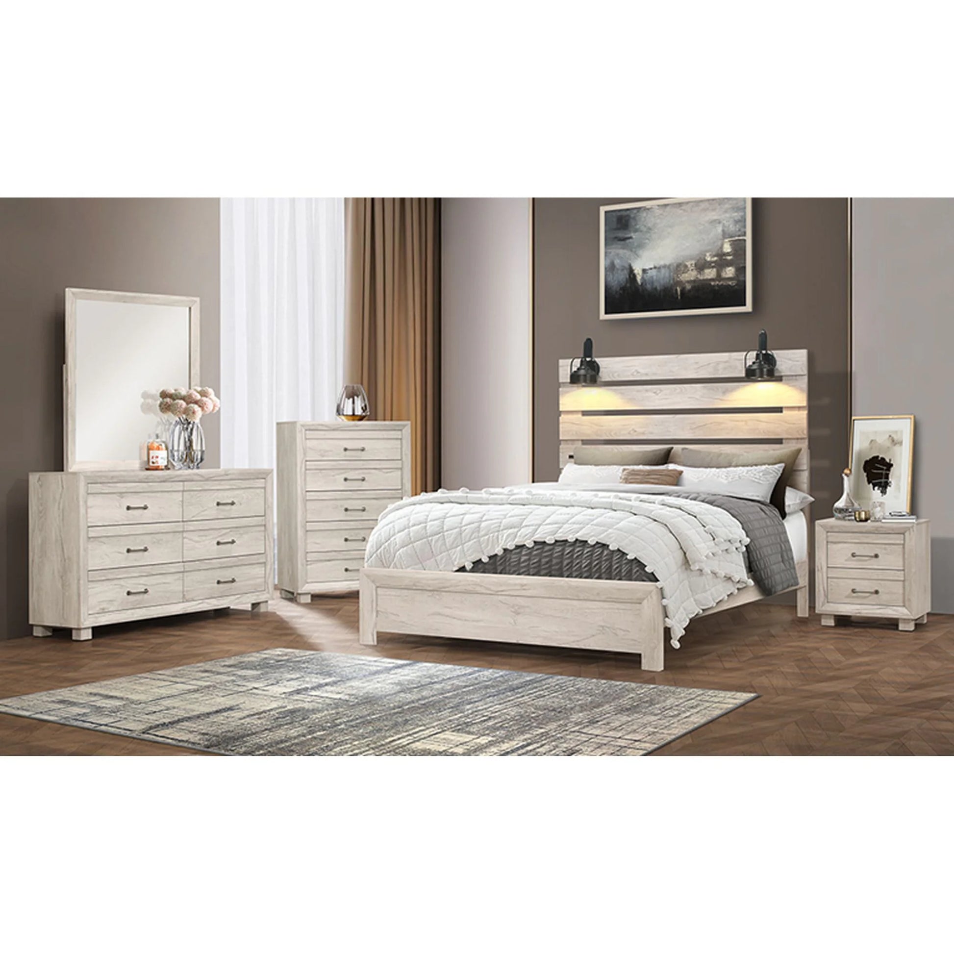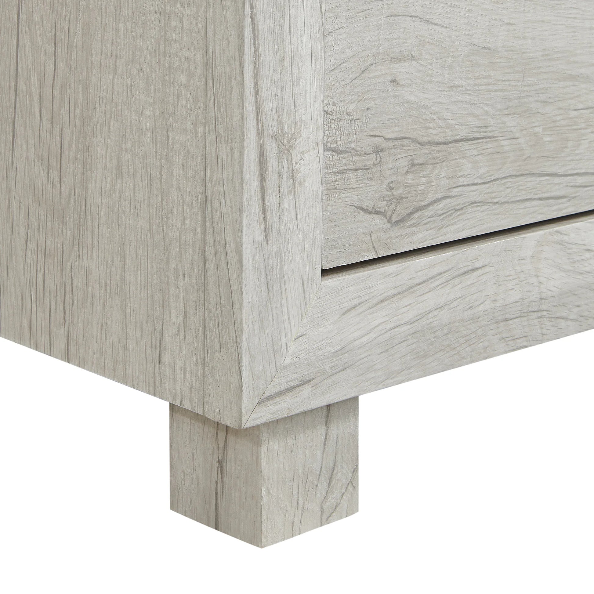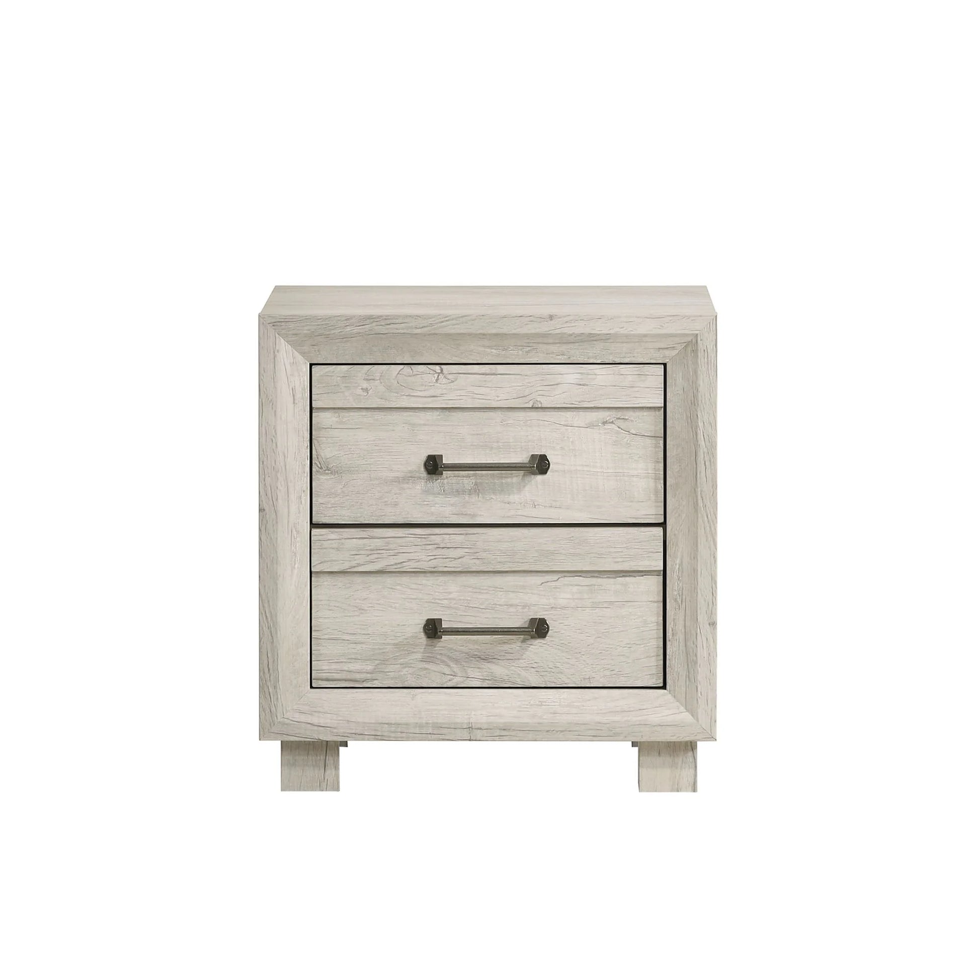 The Fort Worth 2-Drawer Nightstand features angled, solid wood framing, giving it a unique and rustic look. The grove detail on the drawer fronts and industrial metal pulls add elegance to the overall design. Its two drawers provide ample storage space while its USB outlet offers convenient charging for your devices. Crafted with 3D wood grain PU paper veneer, this nightstand has a realistic wood texture that adds depth to its appearance. The block feet provide stability and durability while the felt-lined top drawer ensures that your delicate items are protected.
