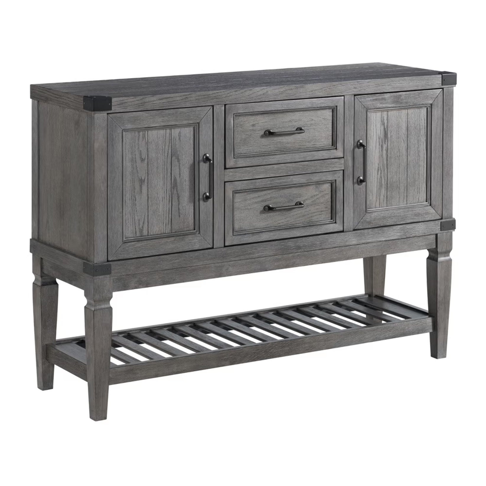 The Foundry Dining Collection is offered in a wire-brushed Pewter Finish for a natural, rustic appeal. Constructed from Oak Veneer and Select Hardwood, with metal accent plates throughout.