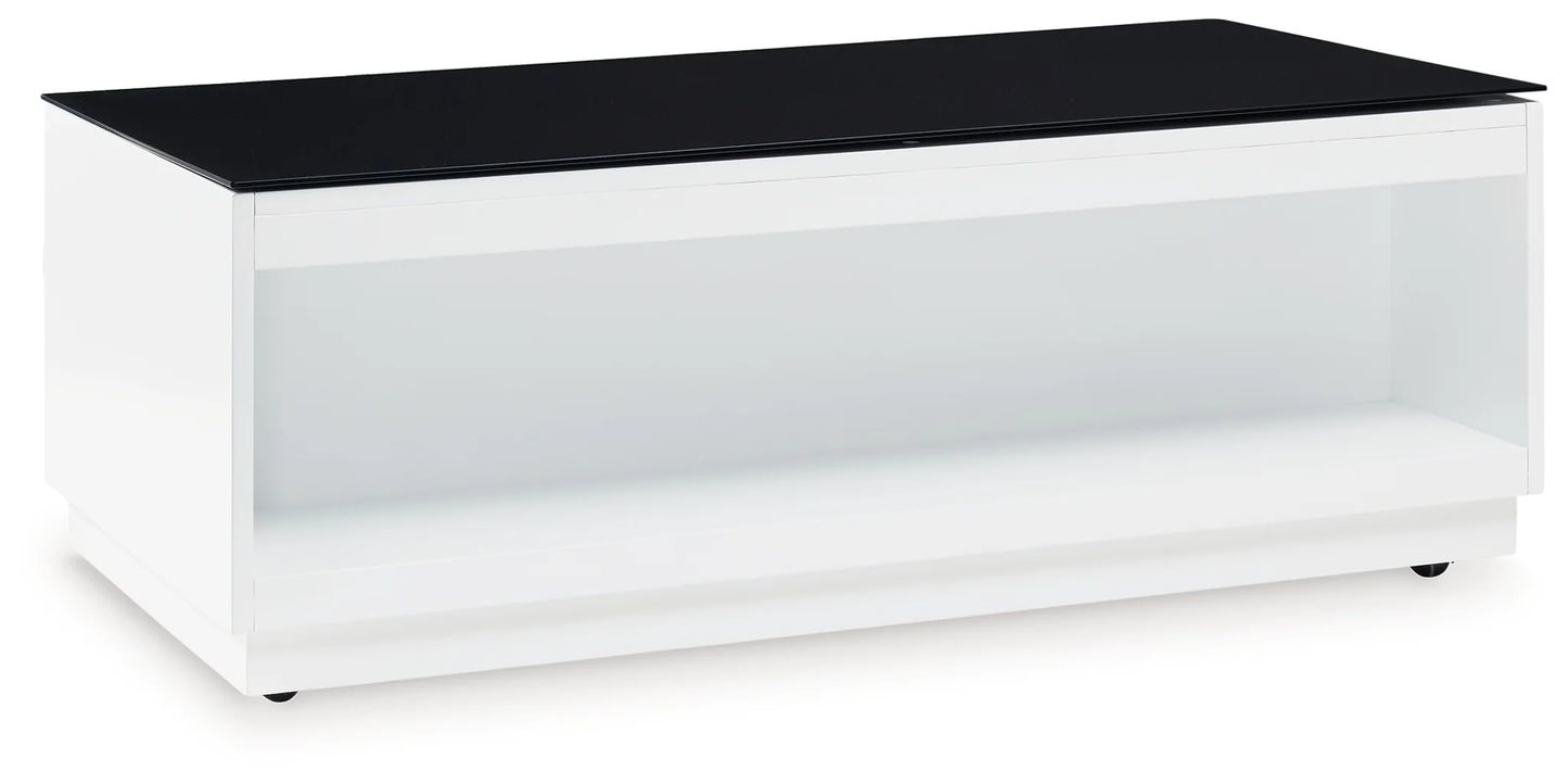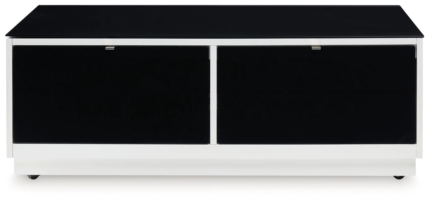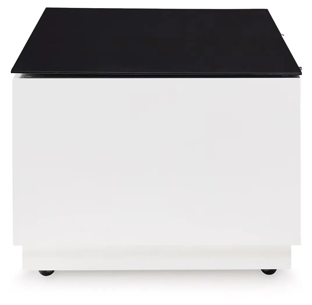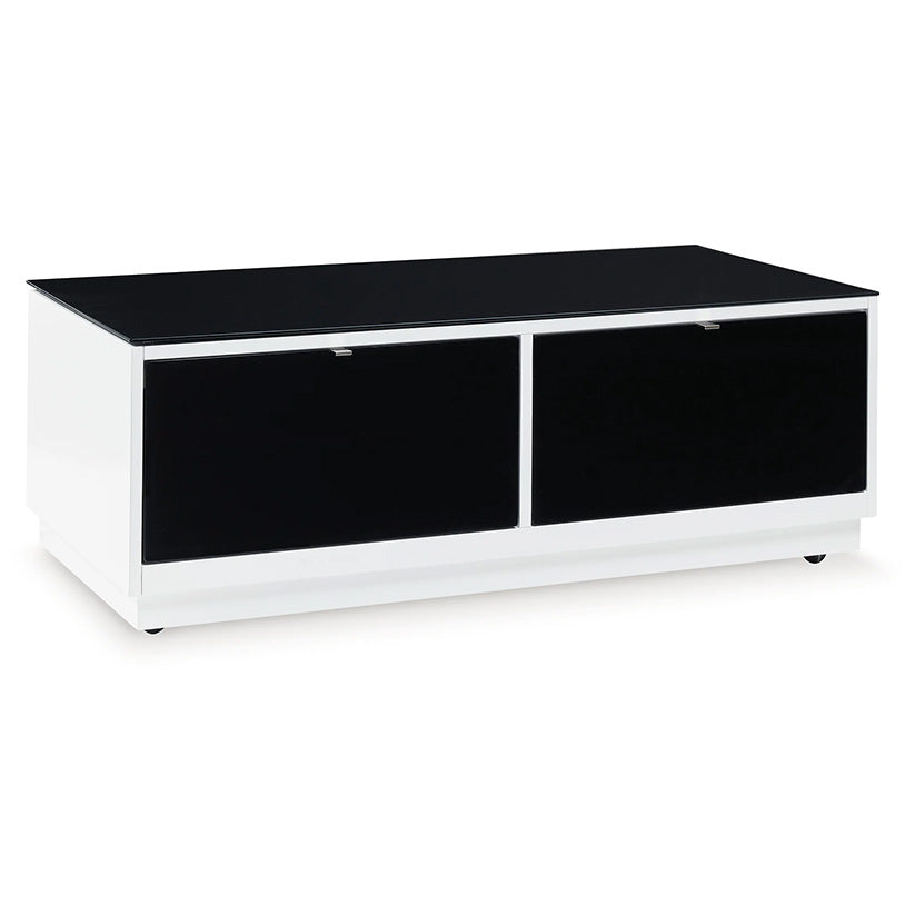 Combining a high-gloss white finish with a black glass tabletop, this coffee table proves opposites really do attract. It's the perfect blend of modern style and functionality, with two roomy drawers for storing essentials and a large open display shelf for decorative items. Want to rearrange the furniture? Casters make it easy to adapt to any situation.
