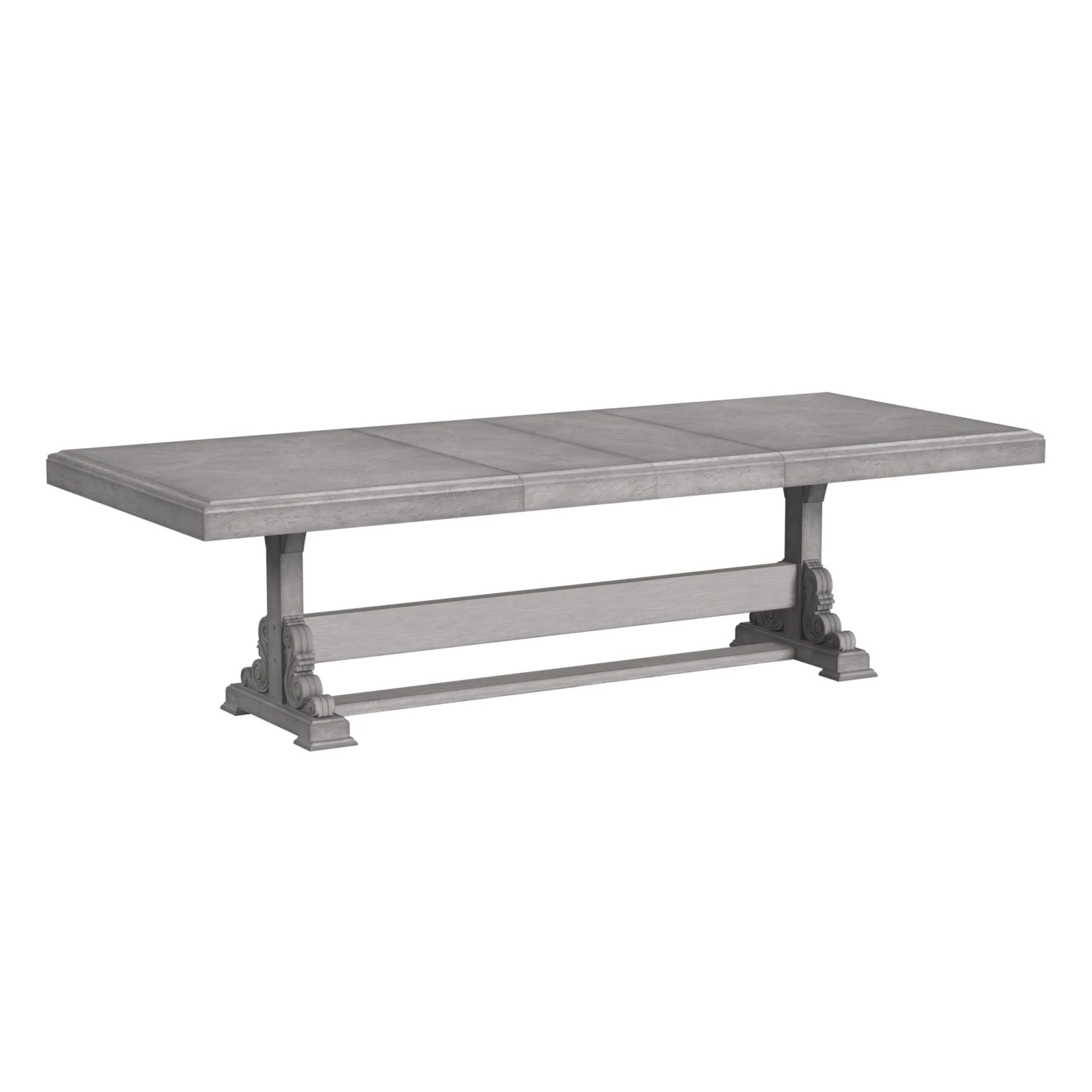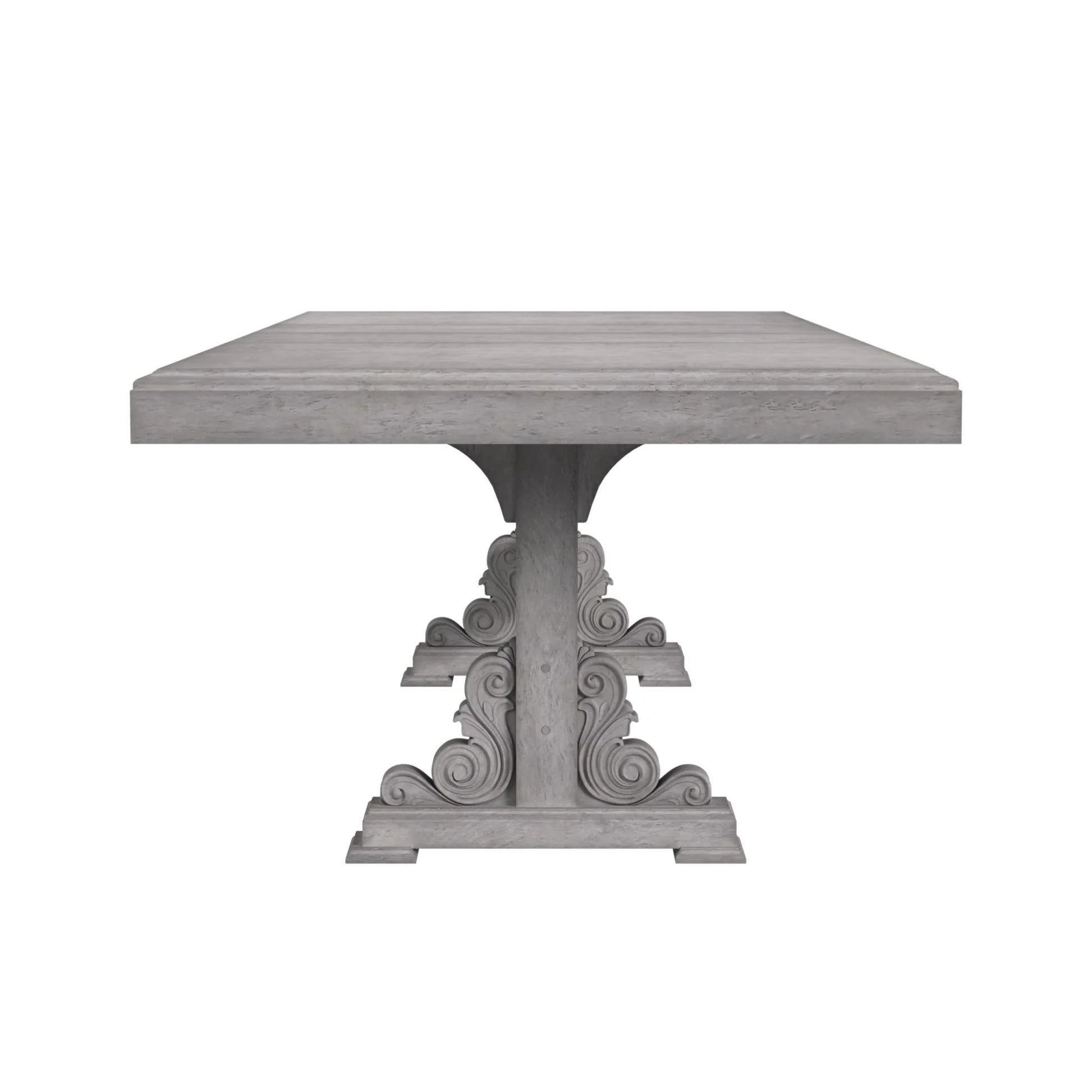 The grand Glenmore Dining Table invites elegance and heritage into your home, with its timeless design and aged, grey finish. The sturdy trestle base features exquisite carvings, embodying both strength and beauty, making it the perfect centerpiece for cherished family gatherings or refined dinner parties. Its generous length can be extended with two 18-inch leaves, effortlessly accommodating additional guests while preserving an intimate atmosphere. Gather around the magnificent Glenmore Dining Table and create lasting memories with guests, where every meal feels like a special occasion and every conversation endures just a little longer.